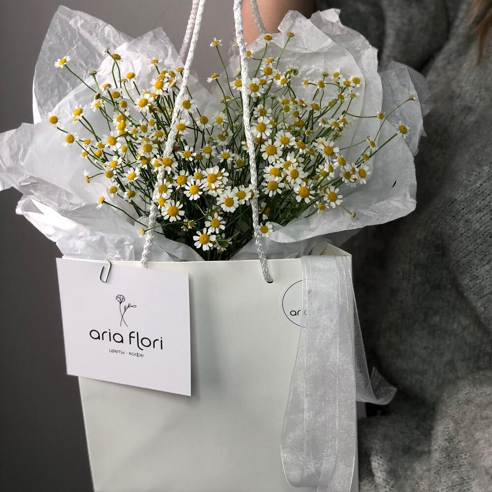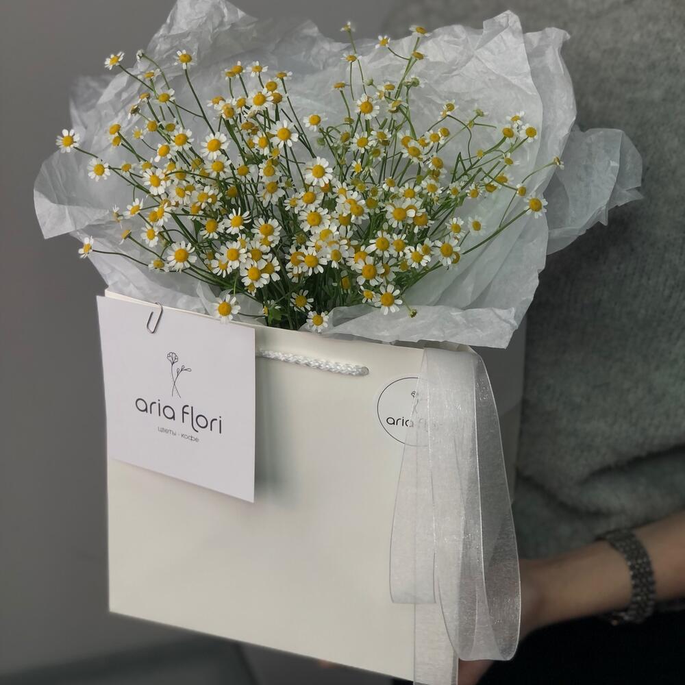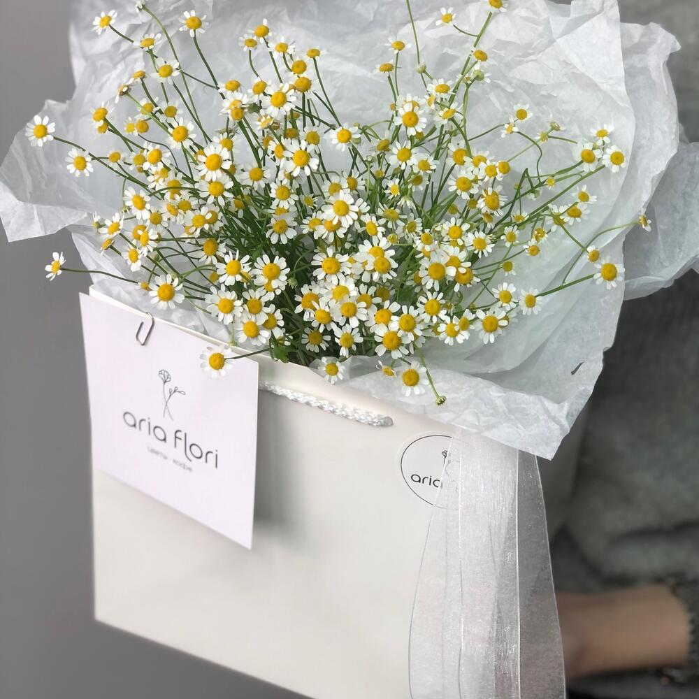 Мелкие Ромашки – всегда заряжают позитивным настроением, простота и легкость в этом цветке:3Стильная упаковка в сумку/пакет придало ей шарма и удобства в транспортировке