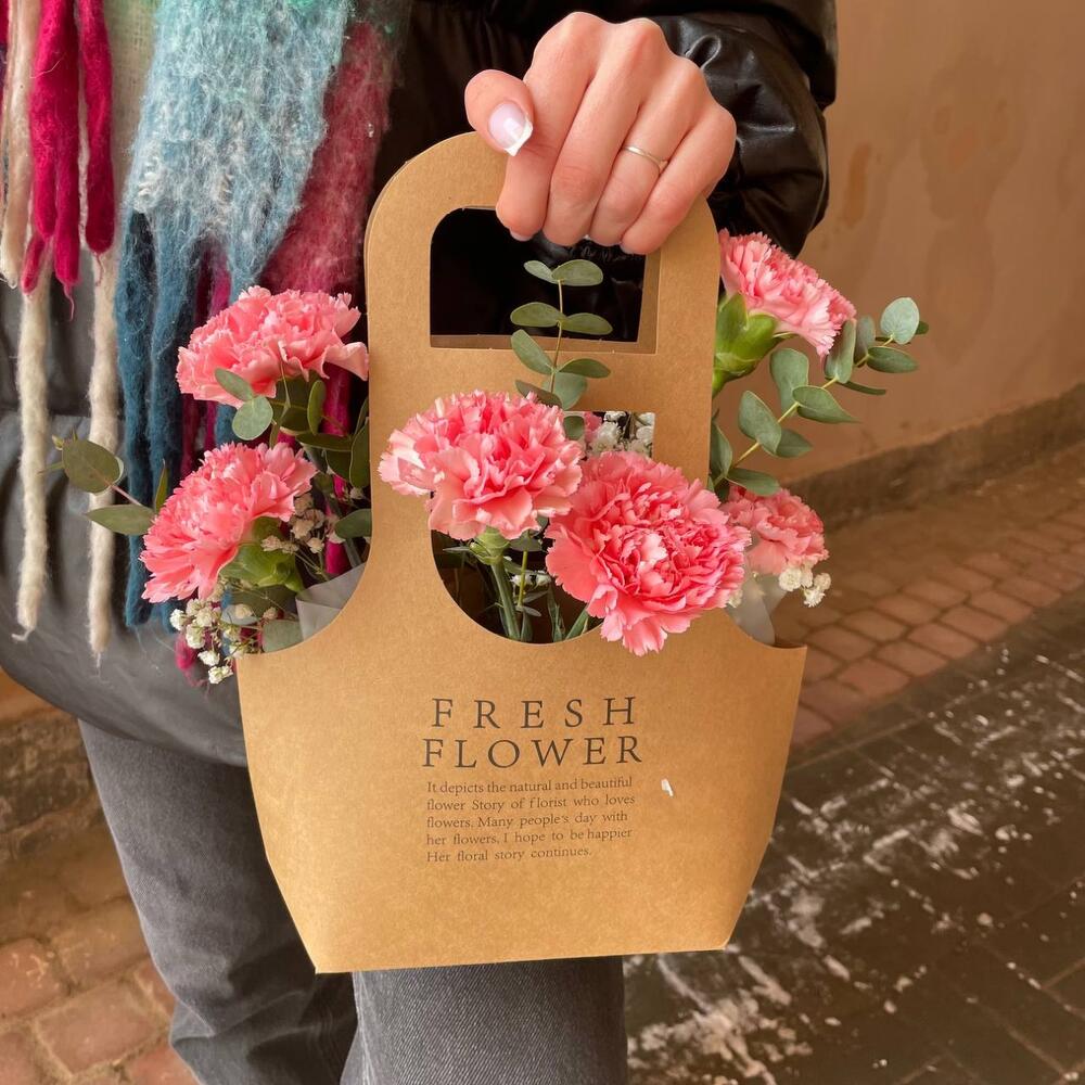 Цвет гвоздик может отличаться от фотоРекомендации по уходу:- цветы находятся во флористической губке, которую необходимо поливать 1 раз в 2-3 дня;- тонкой струёй воды в центре композиции, не попадая на цветы;- держать вдали от отопительных приборов и кондиционеров.