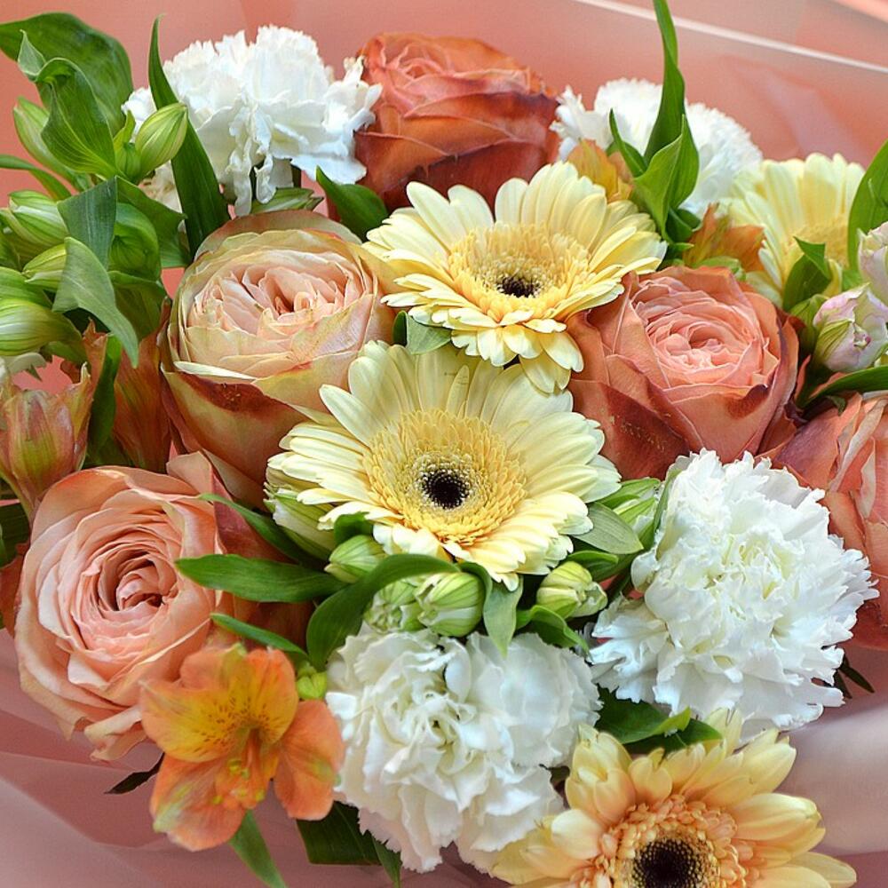 пионовидные розы – 5 шт.Альстромерия – 6 шт.герберы – 3 шт.диантусы – 5 шт.стильная упаковка букет – 1 шт.