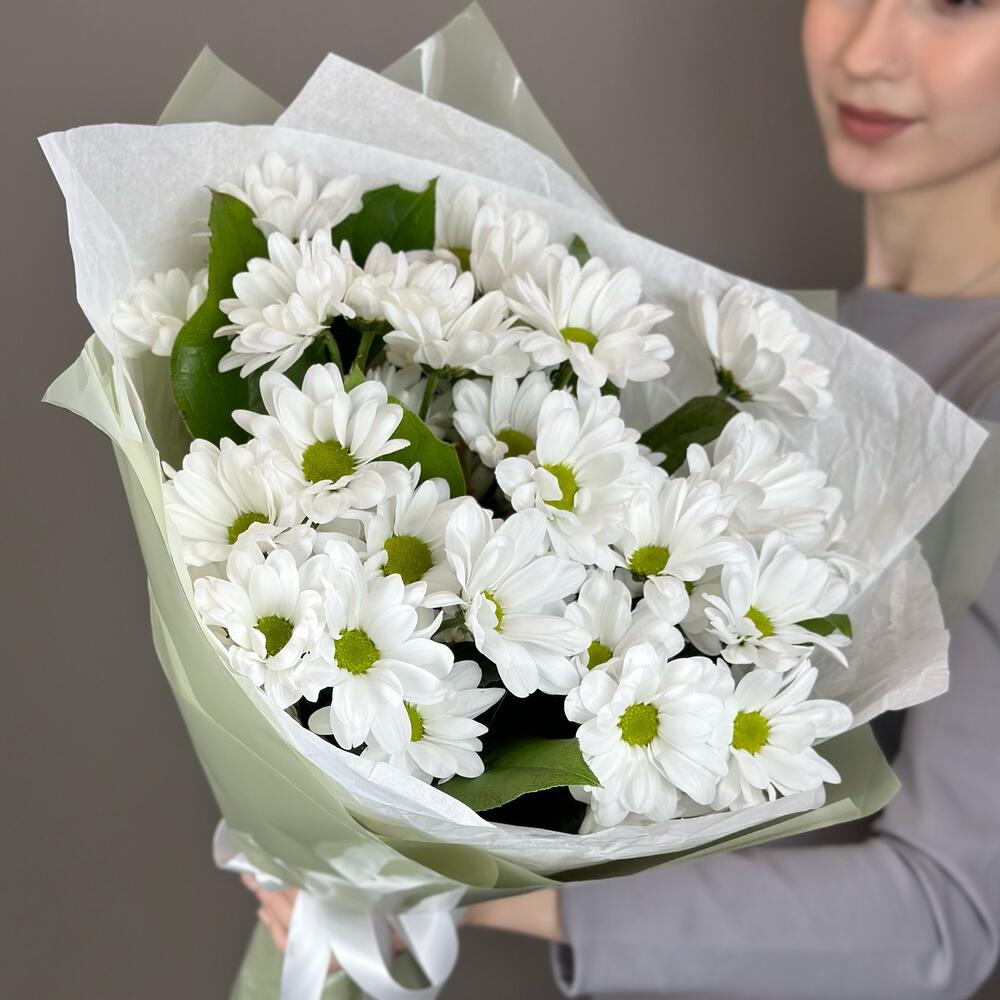 Фисташка – 3 шт.Лента атласная – 1 шт.Упаковка дизайнерская – 1 шт.Хризантема Кустовая Бакарди белая – 5 шт.Тишью белое – 1 шт.