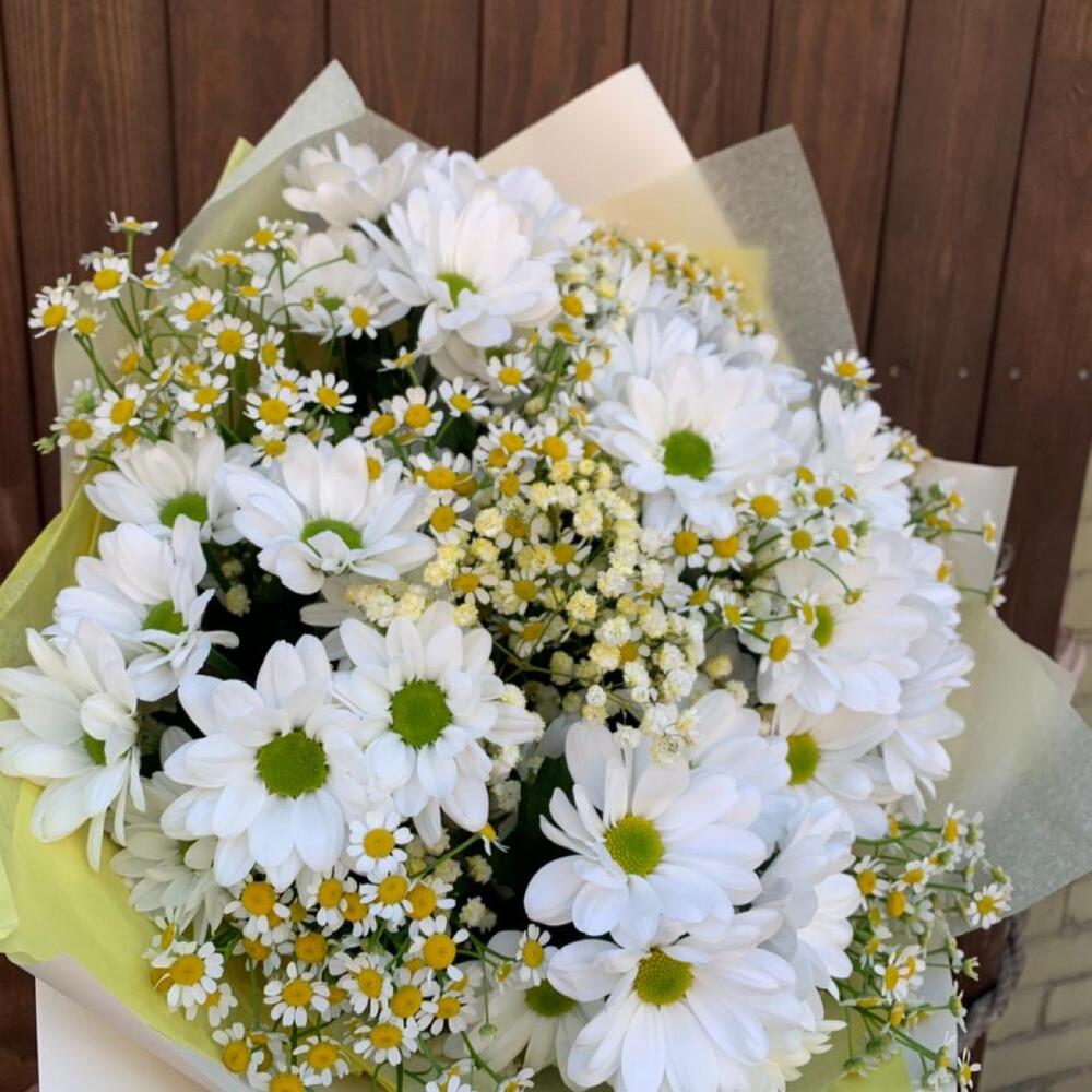 Хризантема кустовая – 5 шт.Матрикария (Ромашка Камила) – 5 шт.Гипсофила – 3 шт.Упаковка дизайнерская – 2 шт.Лента атласная – 2 шт.