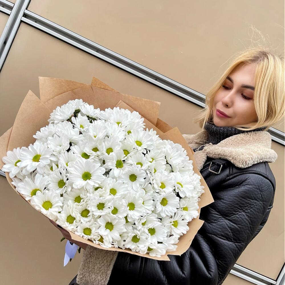 Хризантема кустовая – 17 шт.Лента атласная – 1 шт.Крафт упаковка – 1 шт.