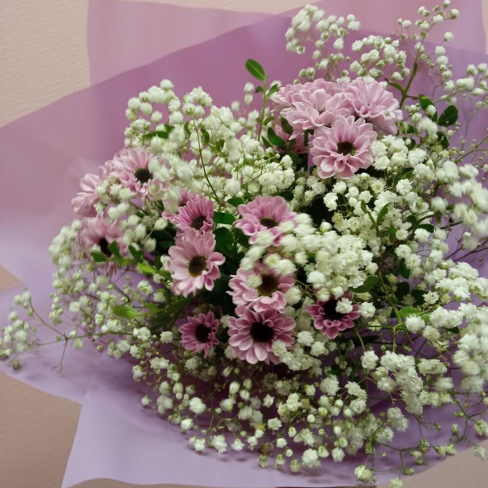 Гипсофила – 3 шт.Лента – 1 шт.Хризантема Сантини – 3 шт.Упаковка – 1 шт.зелень декоративная – 1 шт.
