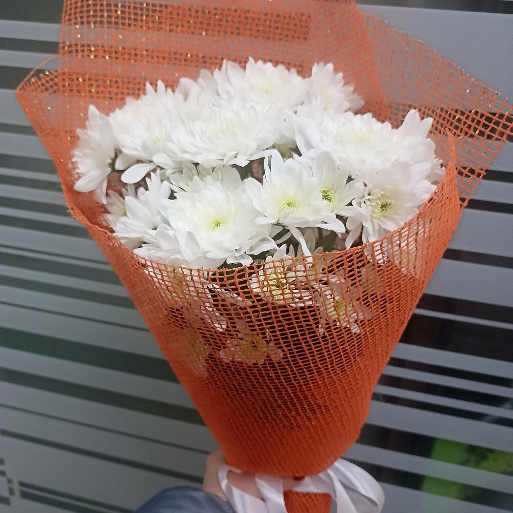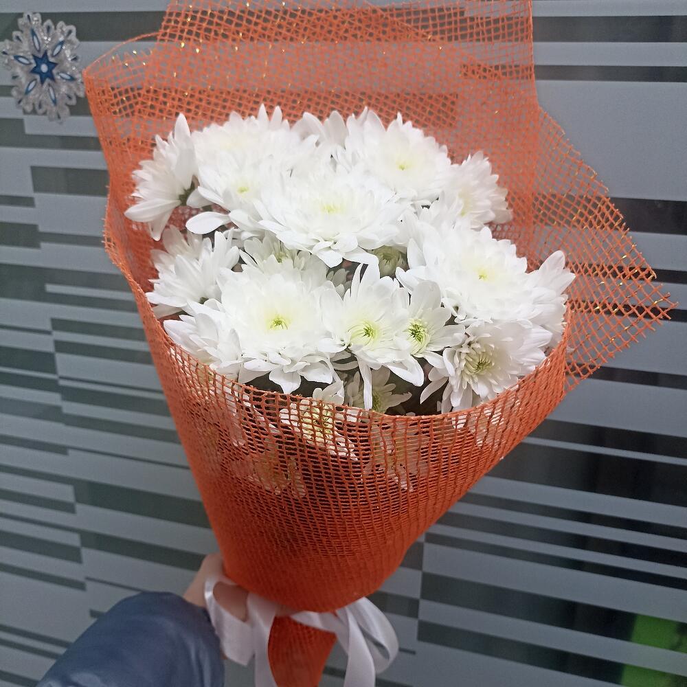 Лента атласная – 1 шт.Хризантема кустовая белая – 5 шт.Сетка – 2 шт.