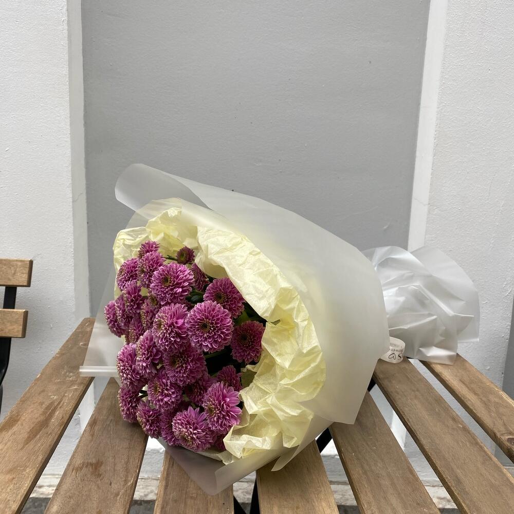 Хризантема помпон – 5 шт.Тишью – 2 шт.Упаковка дизайнерская – 4 шт.лента атласная брендированная – 1 шт.
