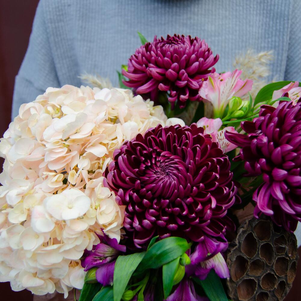 Хризантема – 3 шт. Гортензия – 1 шт. Лотос – 1 шт. Альстромерия – 3 шт. мискантус – 1 шт.