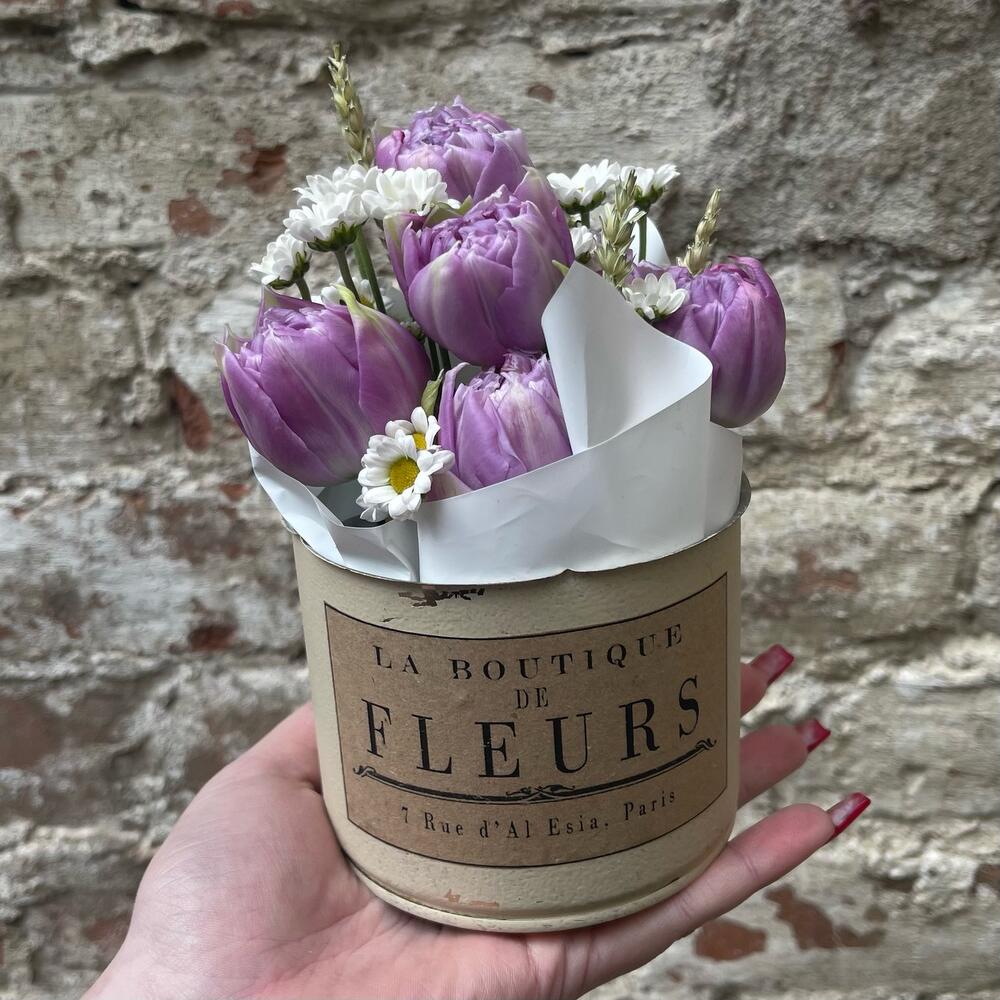 Хризантема Сантини – 1 шт.Тюльпан пионовидный – 6 шт.Упаковка дизайнерская – 1 шт.