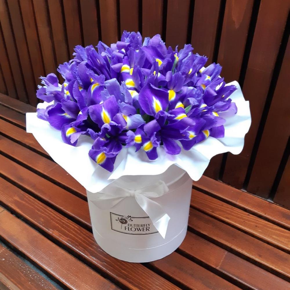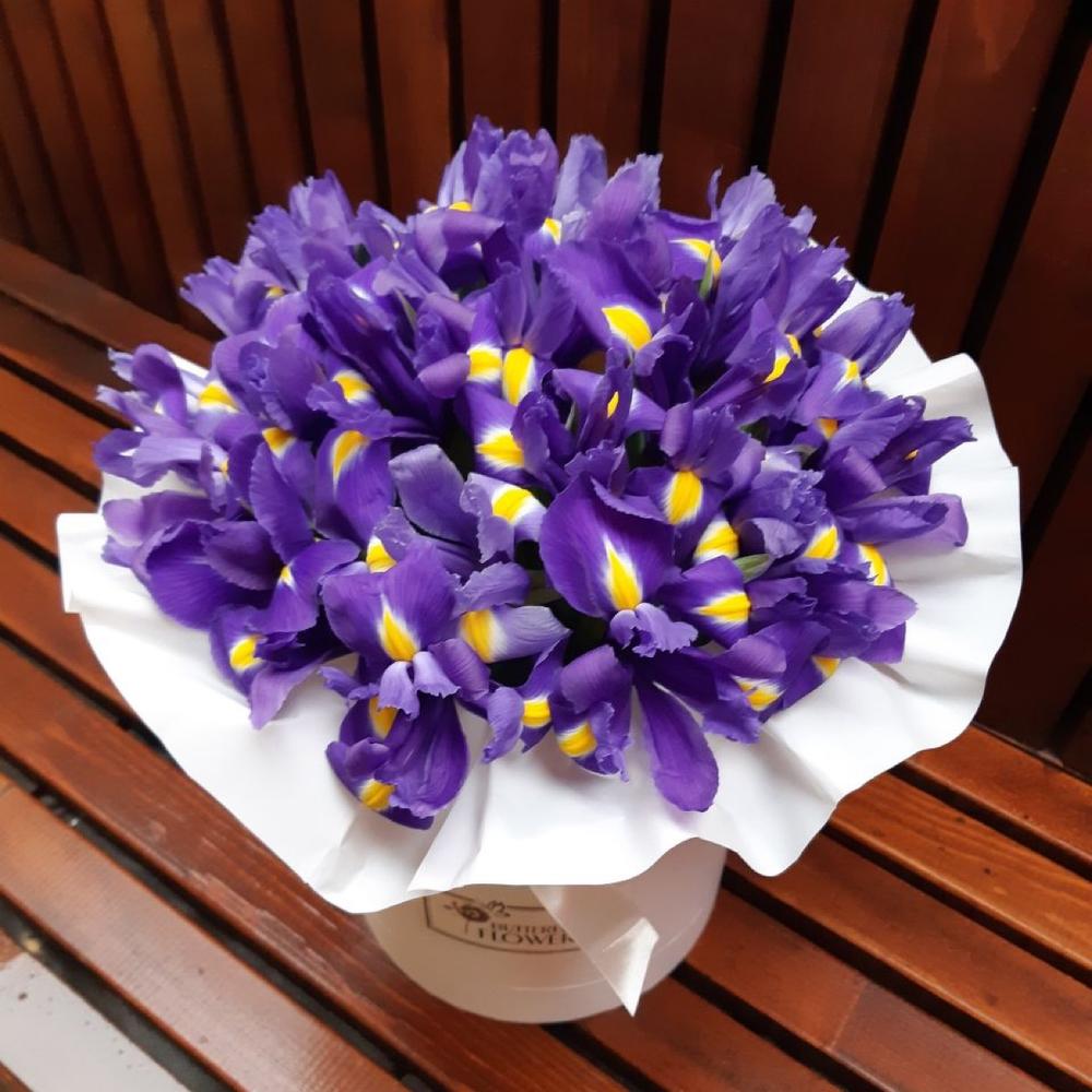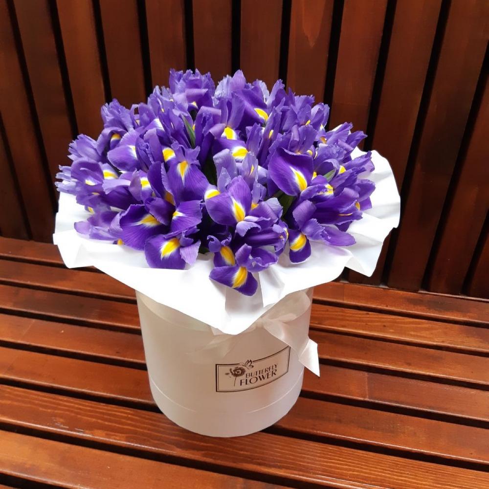 Красивый, яркий букет из 35 ирисов в белой шляпной коробке “Байкал”