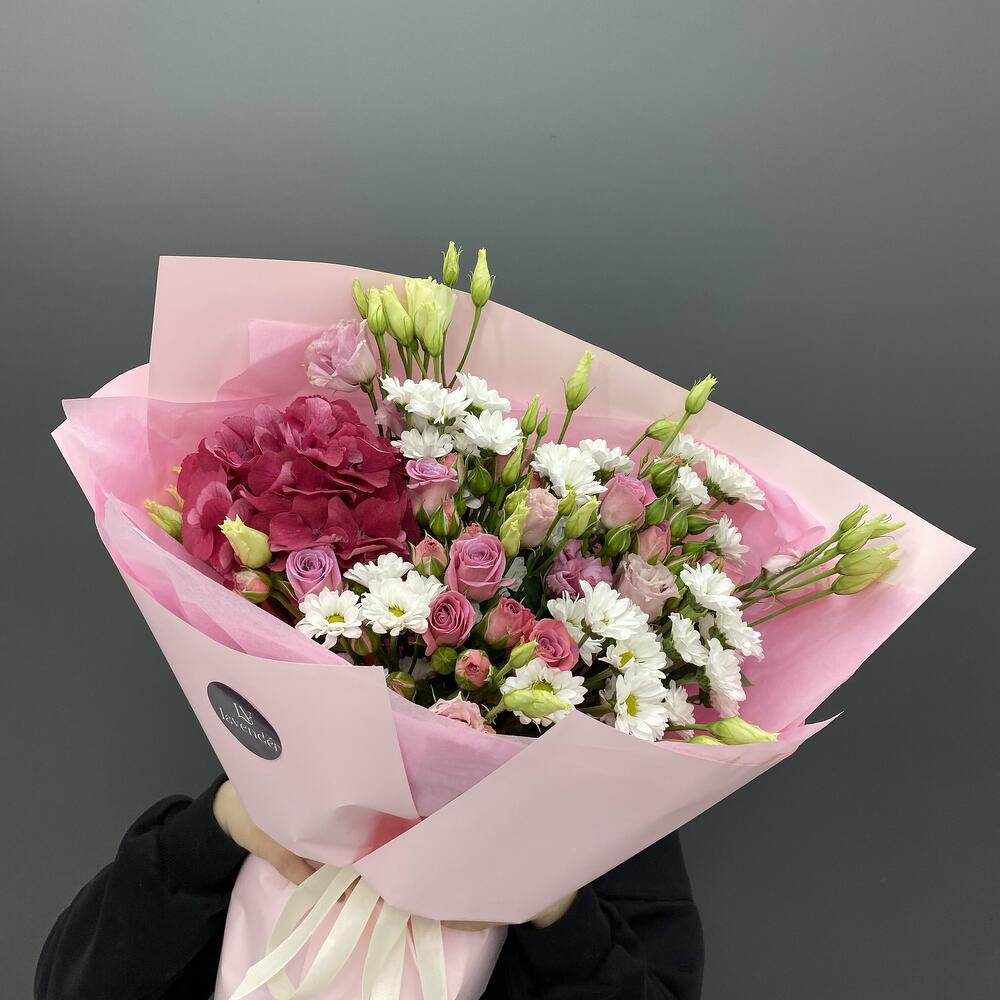 Альстромерии, Гвоздики, Кустовые розы, Лизиантусы, Розы, Хризантемы