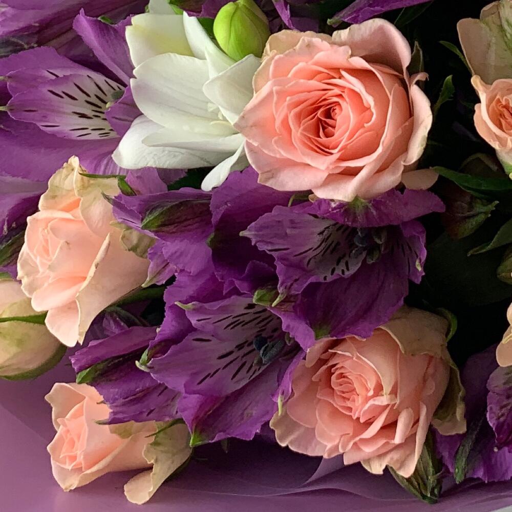 Кустовая роза – 6 шт.Альстромерия – 5 шт.Фрезия – 5 шт.Матовая пленка – 1 шт.Лента – 1 шт.любовь флориста (бесплатно) – 1 шт.