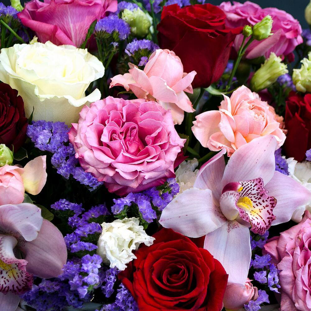 Статица – 10 шт.эустома белая – 5 шт.Орхидеи – 5 шт.зелень декоративная – 10 шт.розы эквадор – 8 шт.розы пионовидные кустовые – 3 шт.розы пионовидные – 7 шт.