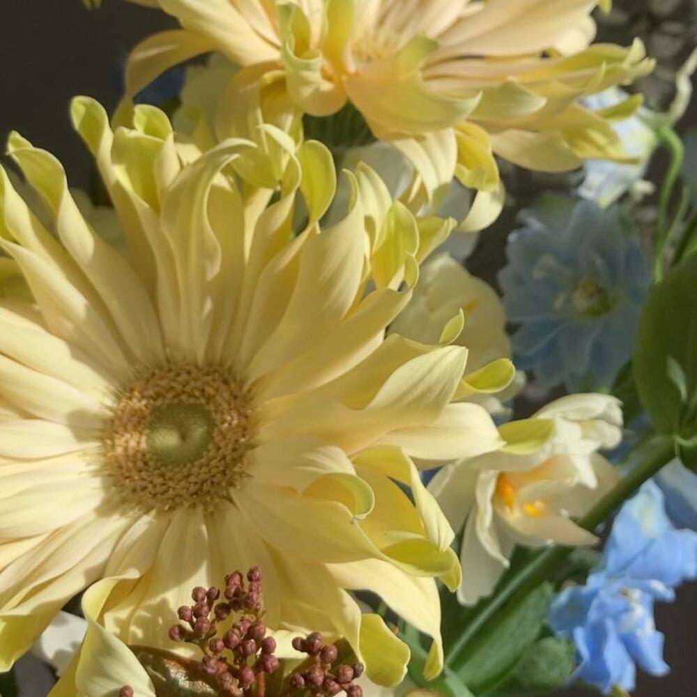 Букет с нарциссами, дельфиниумом и кудрявой герберой