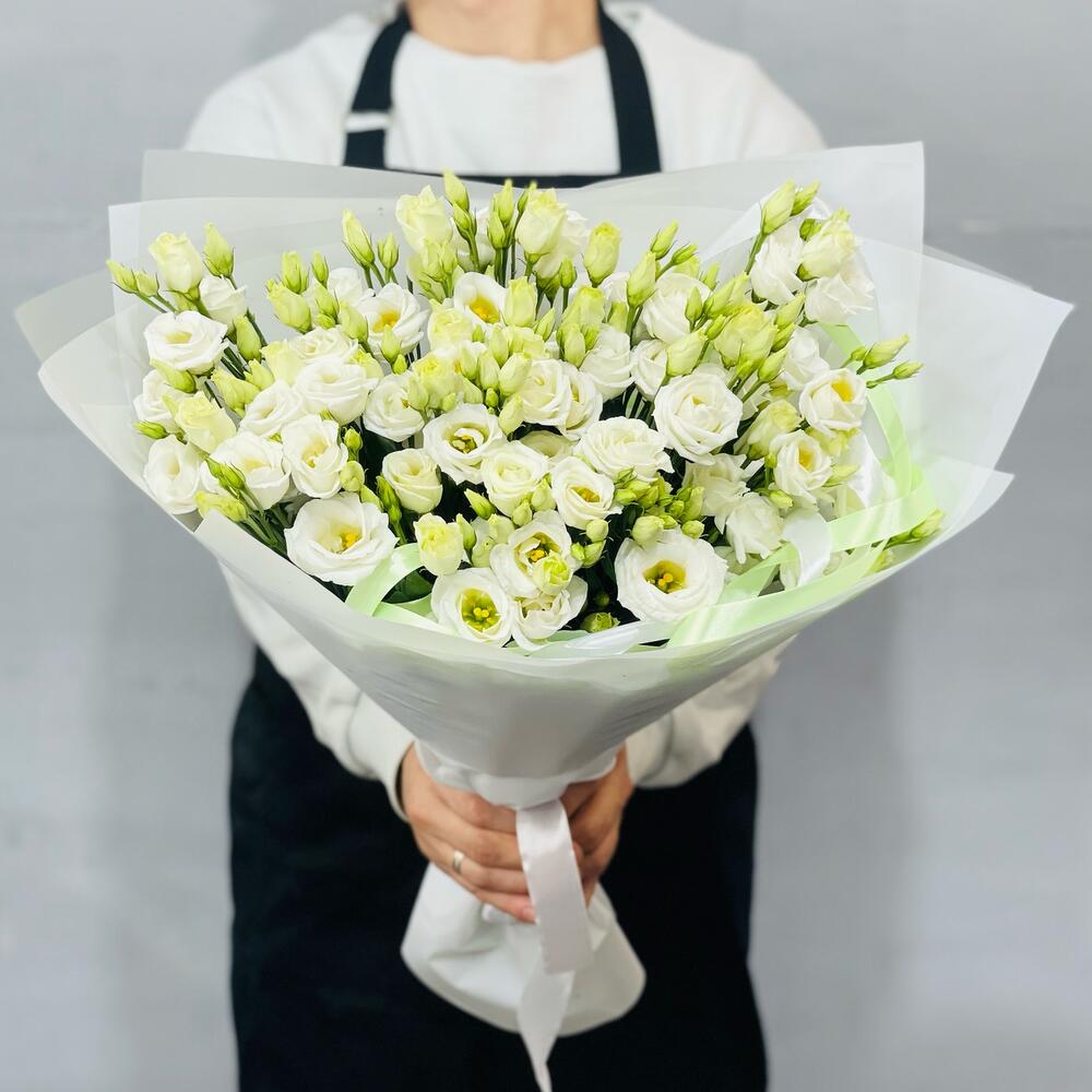 эустома белая – 9 шт.Упаковка дизайнерская – 4 шт.Лента атласная – 3 шт.