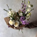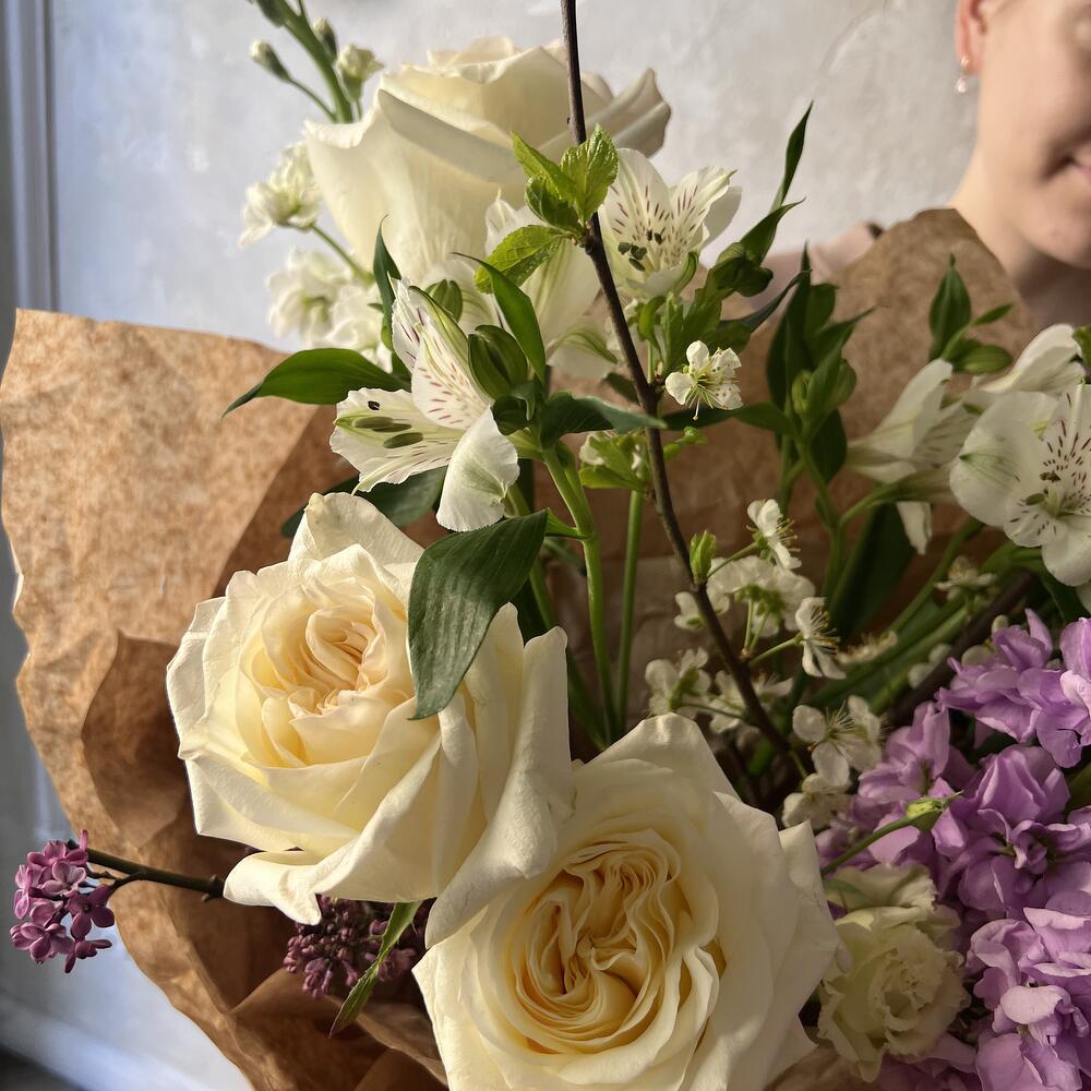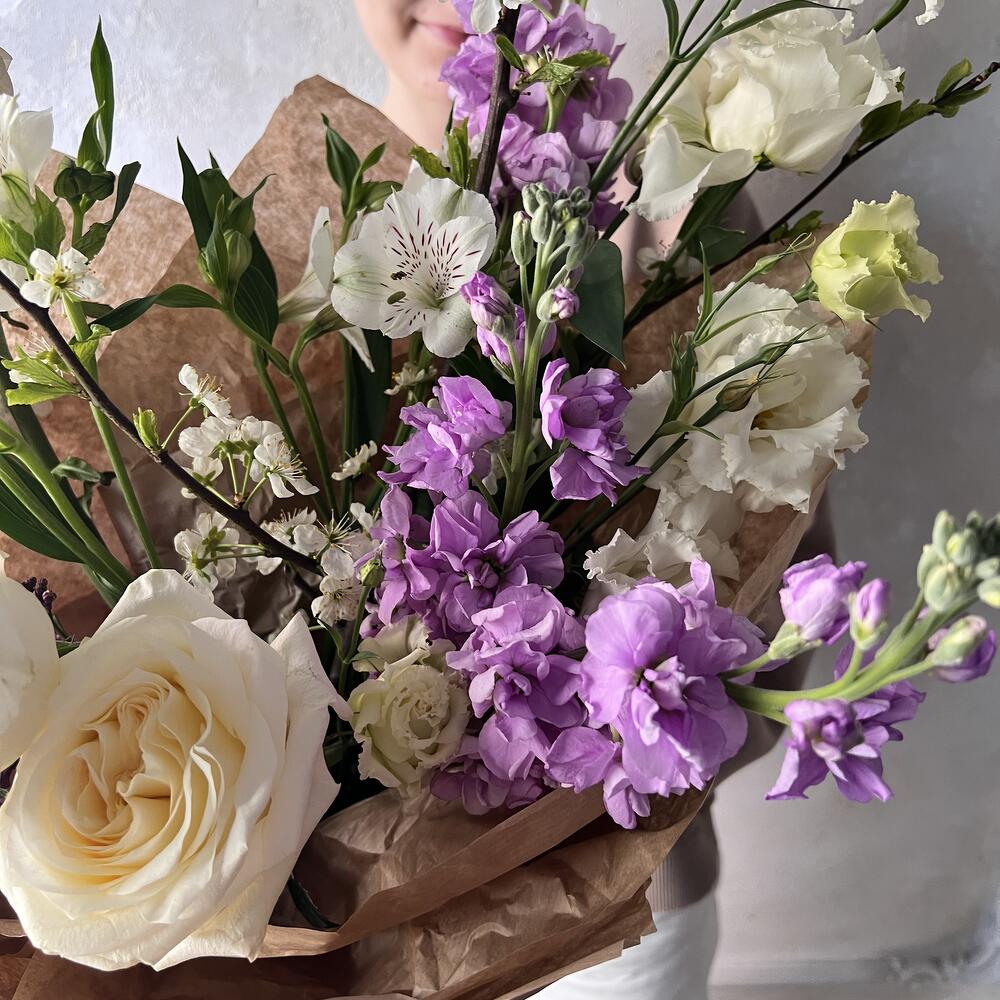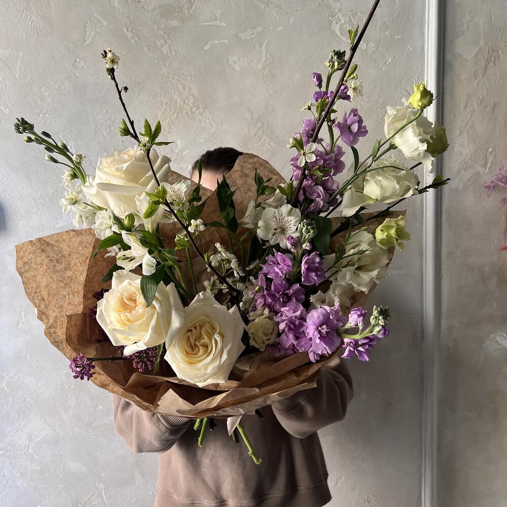 Альстромерия – 2 шт.Лизиантус – 2 шт.Маттиола – 4 шт.Сирень – 1 шт.Роза – 3 шт.Авторская упаковка – 1 шт.ветки черешни – 1 шт.