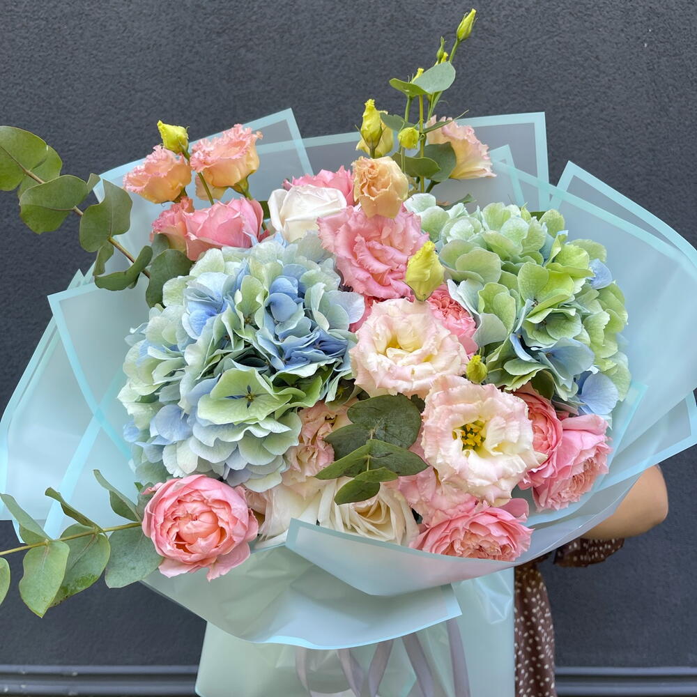 Букет в блакитних тонах від квіткового салону "Blooming" – це ніжна композиція, яка включає в себе гортензії, еустому, евкаліпт і троянди сорту Джульєта.