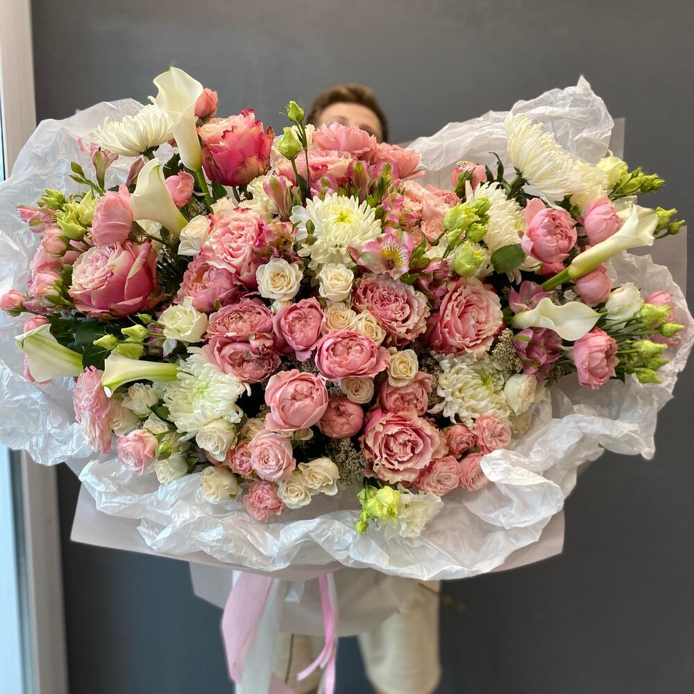 Альстромерия – 7 шт.Эустома – 10 шт.Лента атласная – 2 шт.Упаковка дизайнерская – 10 шт.зелень пучок – 5 шт.магнум белый – 7 шт.розы – 7 шт.розы кустовые – 21 шт.каллы – 7 шт.