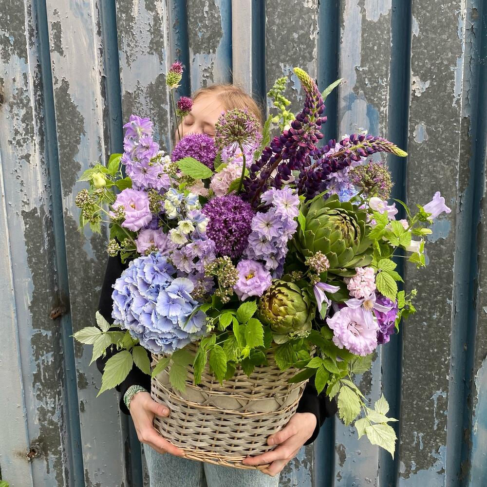 Садовая корзина, с артишоками, гортензиями, ветками малины, люпинами, дельфиниумом, клематисом, колокольчиками, маттиолой и травами.