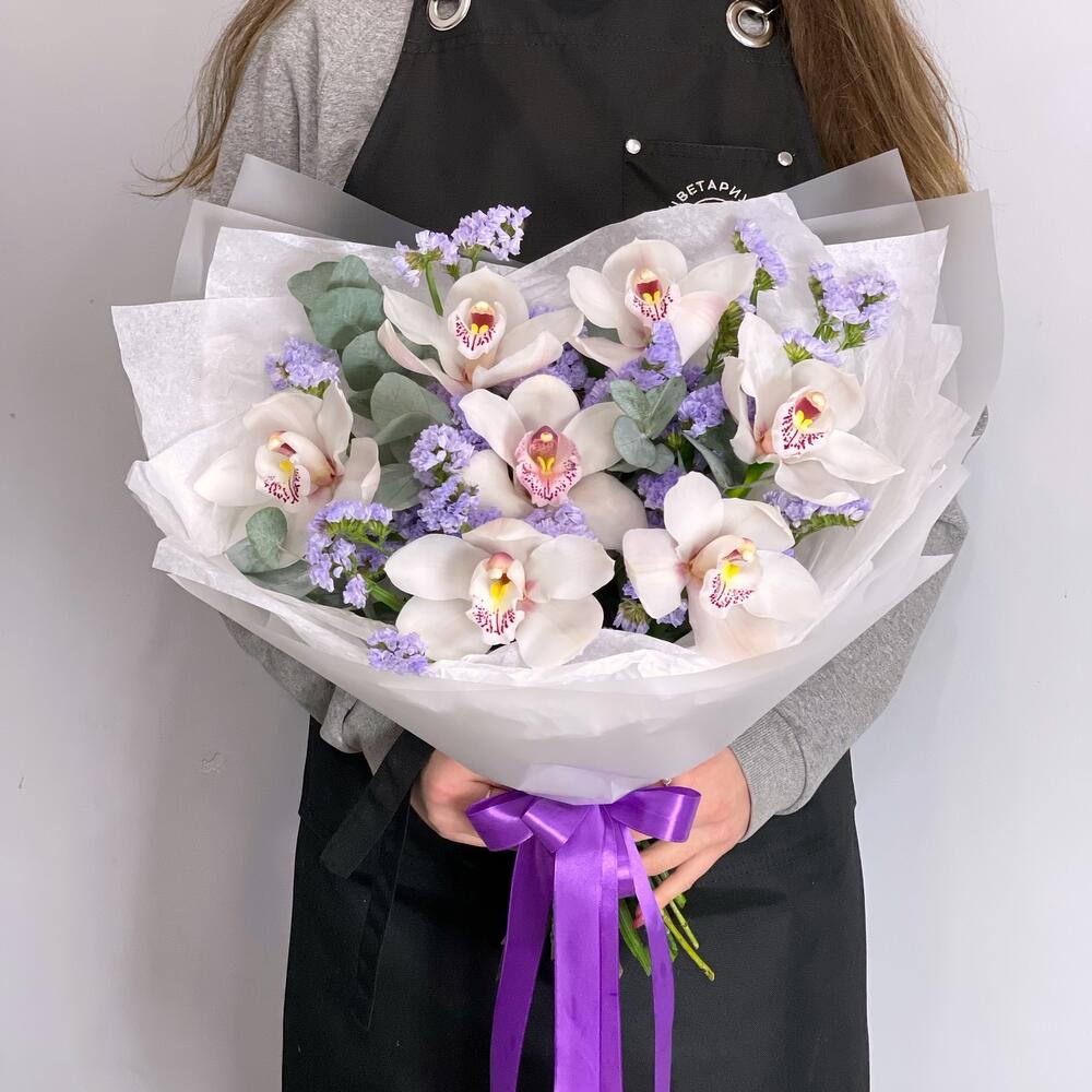 белая орхидея сорт цимбидиум – 7 шт.Статица – 7 шт.Эвкалипт – 2 шт.Упаковка дизайнерская – 1 шт.