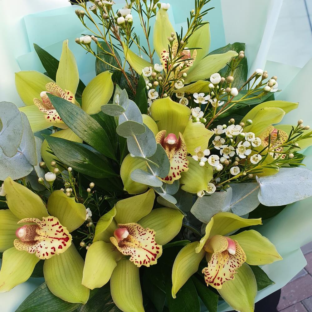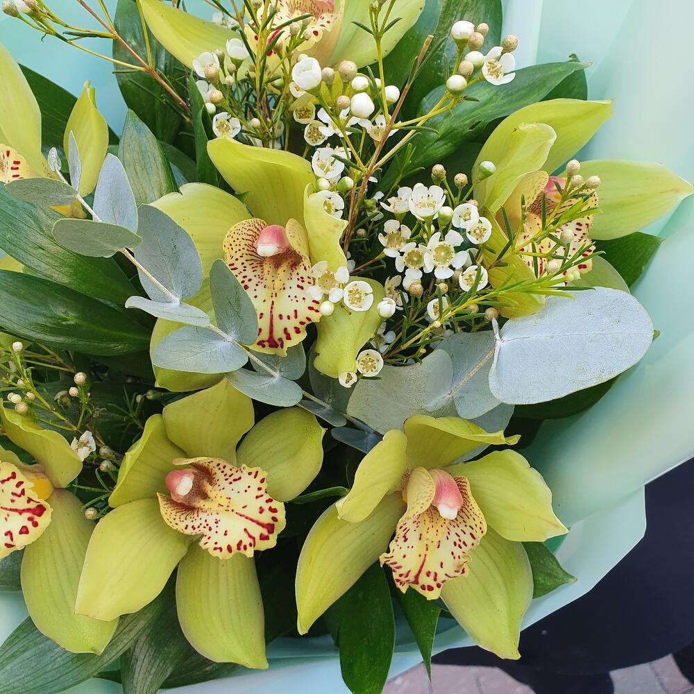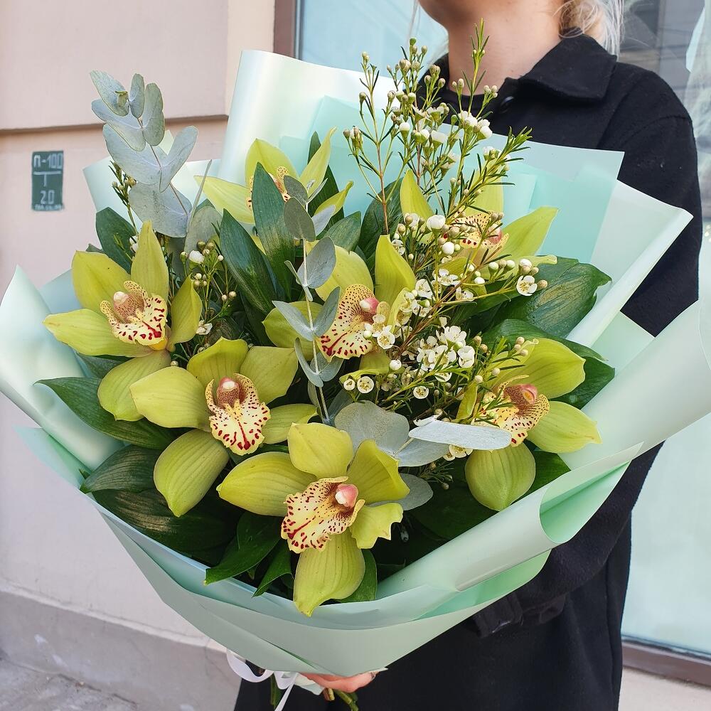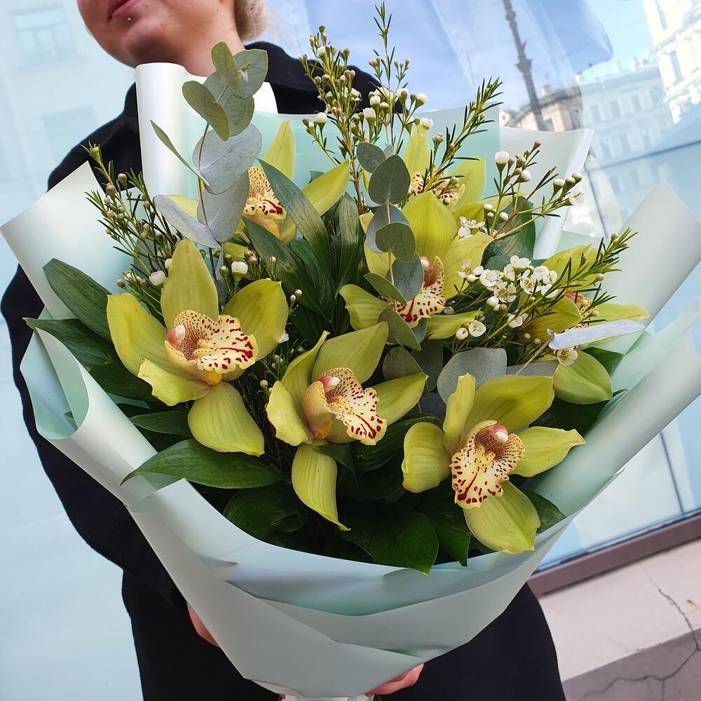 Орхидея Цимбидиум – 7 шт.Эвкалипт – 1 шт.Зелень – 10 шт.Ваксфлауэр – 1 шт.Упаковка дизайнерская – 1 шт.Лента атласная – 1 шт.