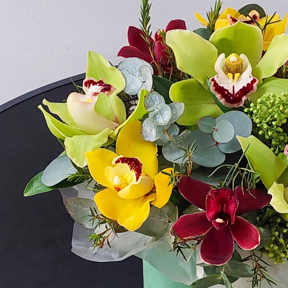 Изысканная композиция в шляпной коробке с орхидеей Цимбидиум микс, скиммией и эвкалиптом.Такой подарок будет очень долгое время радовать своей красотой получателя, так как отличительная особенность орхидей -это их супер длительная вазостойкость и выносливость:)