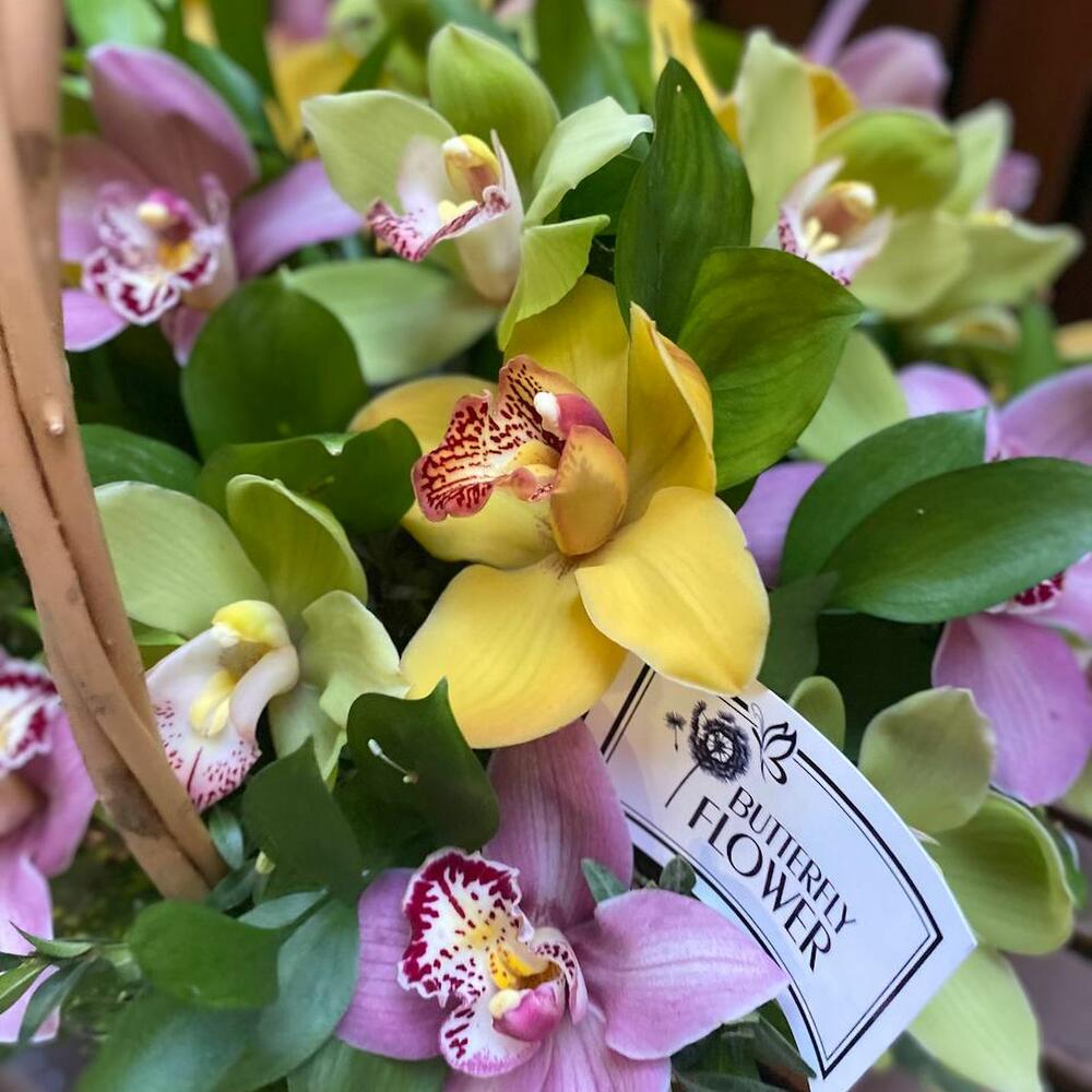 Корзина с розовыми, желтыми и зелеными орхидеями “Тропический сад орхидей”
