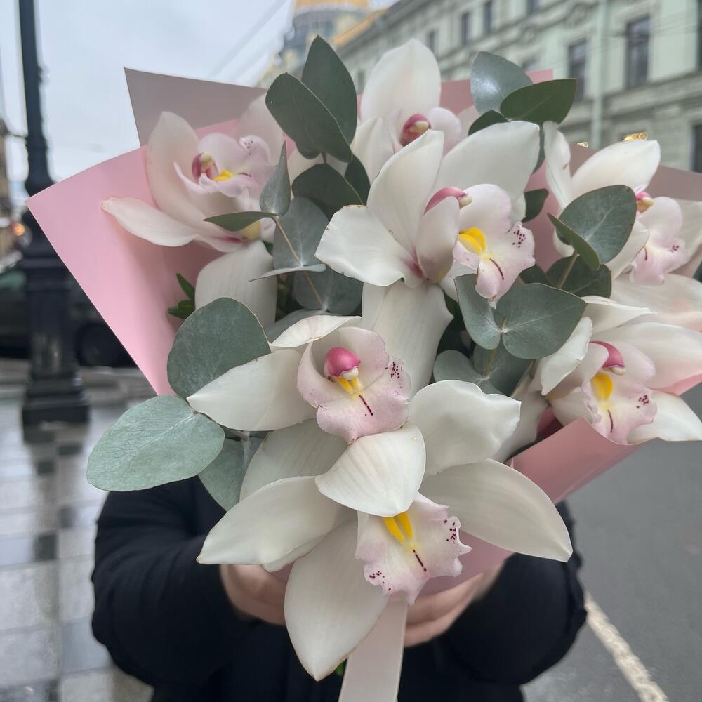 Лента атласная – 2 шт.удлинитель для орхидеи – 7 шт.Упаковка корейская пленка – 1 шт.премиум орхидея цимбидиум – 7 шт.