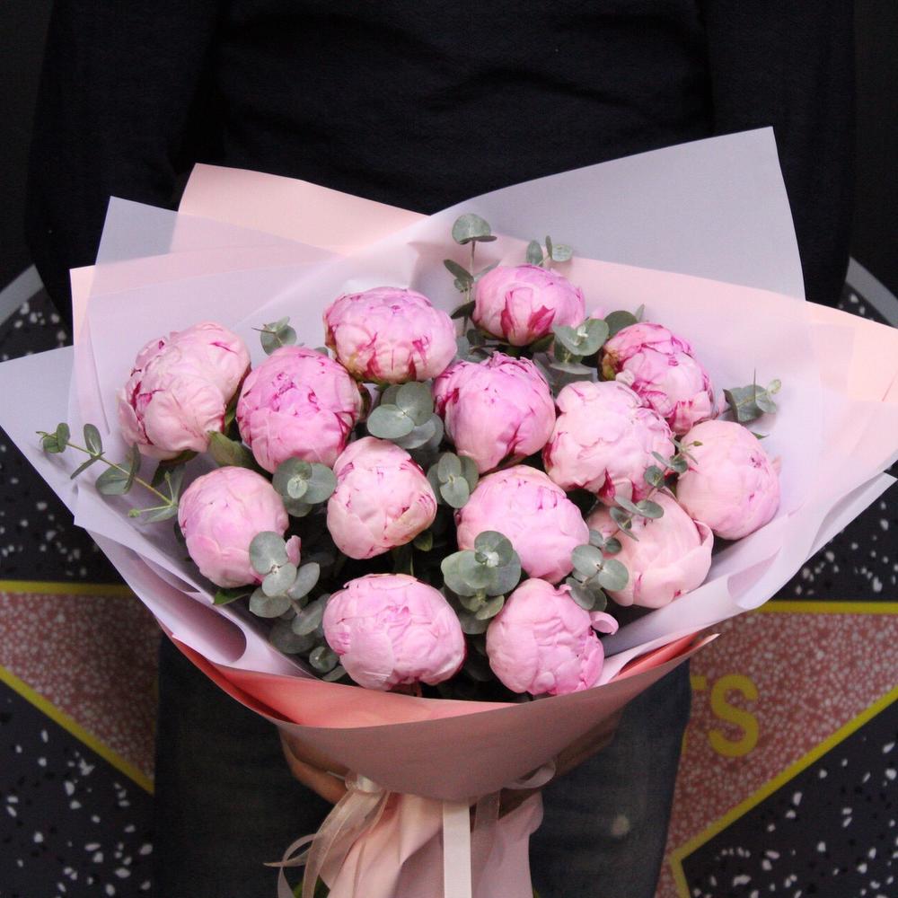 Лента атласная – 3 шт.Пион Сара Бернар – 15 шт.Эвкалипт Baby Blue – 5 шт.