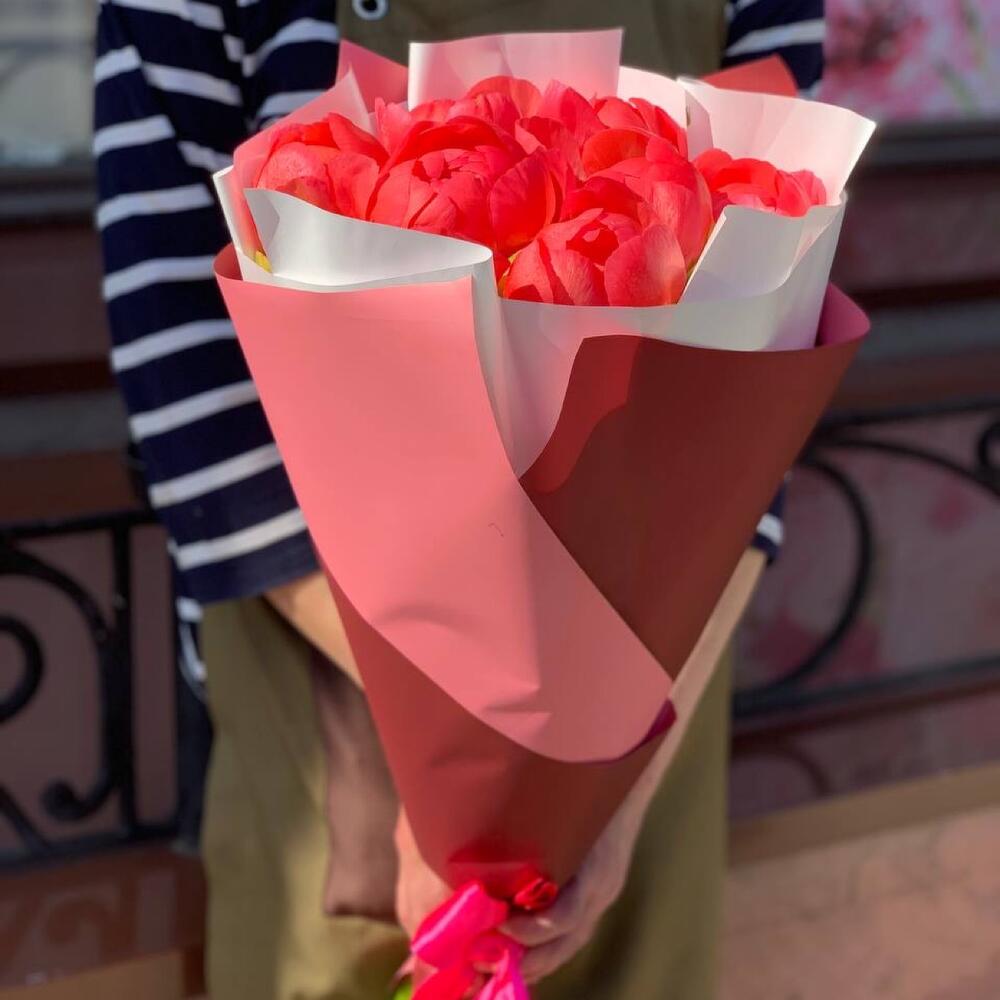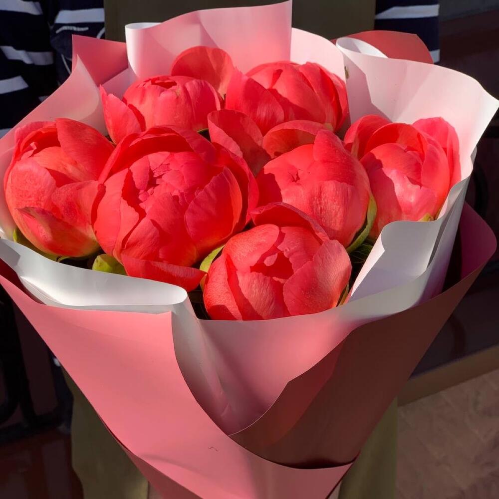 7 пионов Коралл Шарм в дизайнерской упаковке