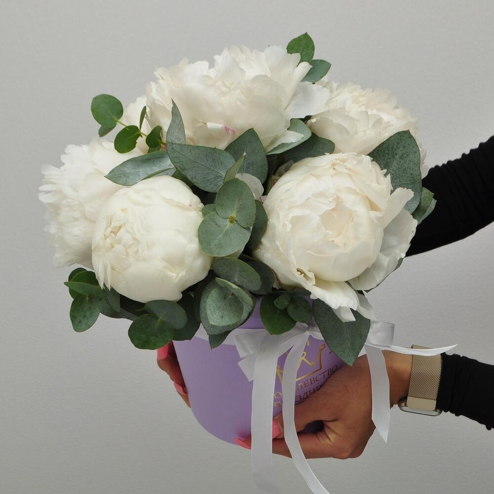 Эвкалипт – 1 шт.Лента атласная – 1 шт.Пион белый – 7 шт.Оазис флористический – 1 шт.Коробка шляпная – 1 шт.