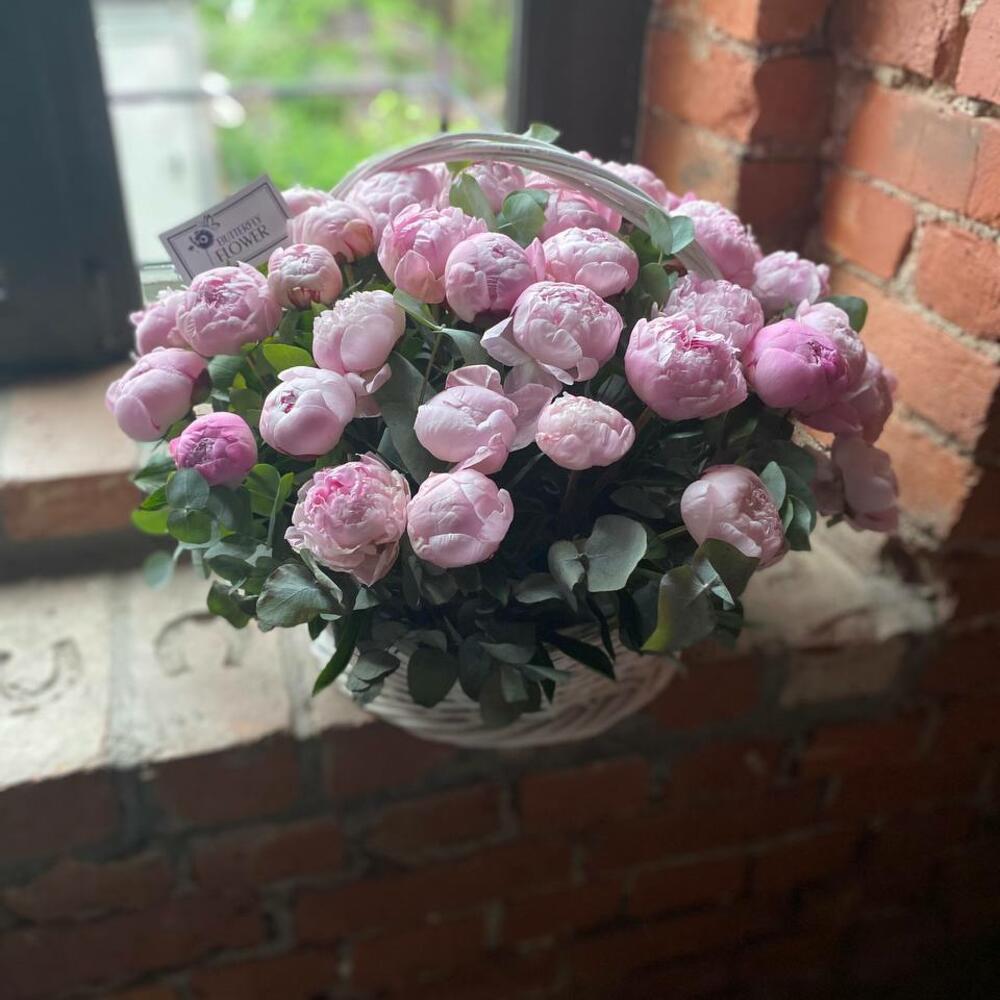 Пион – 51 шт.эвкалипт (банч) – 1 шт.Оазис – 4 шт.Корзина – 1 шт.