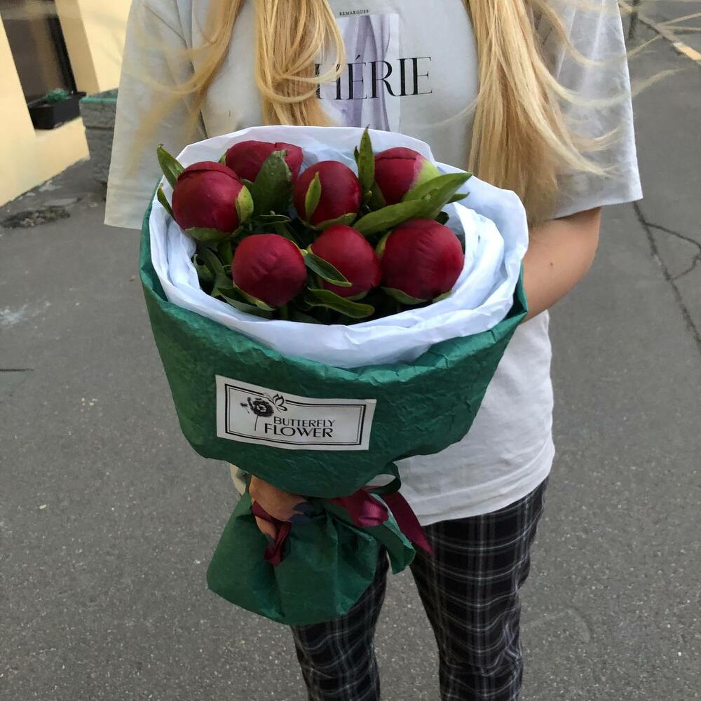 Букет из 7 бордовых пионов в дизайнерской упаковке "Лючия Грация"