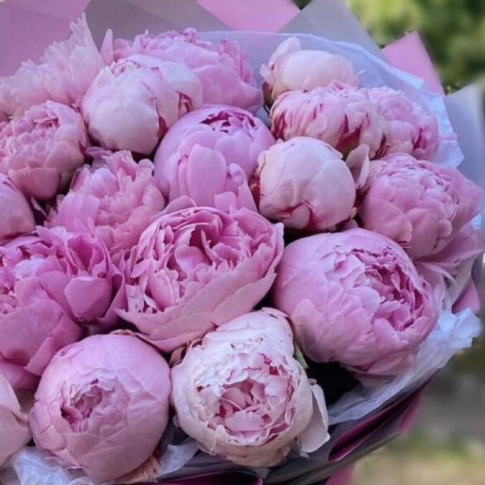 Пион розовый – 21 шт.Упаковка дизайнерская – 3 шт.Лента атласная – 2 шт.Открыточка с вашими пожеланиями – 1 шт.хорошее настроение – 100 шт.инструкция по уходу за цветами – 1 шт.коробка переноска – 1 шт.Кризал – 1 шт.