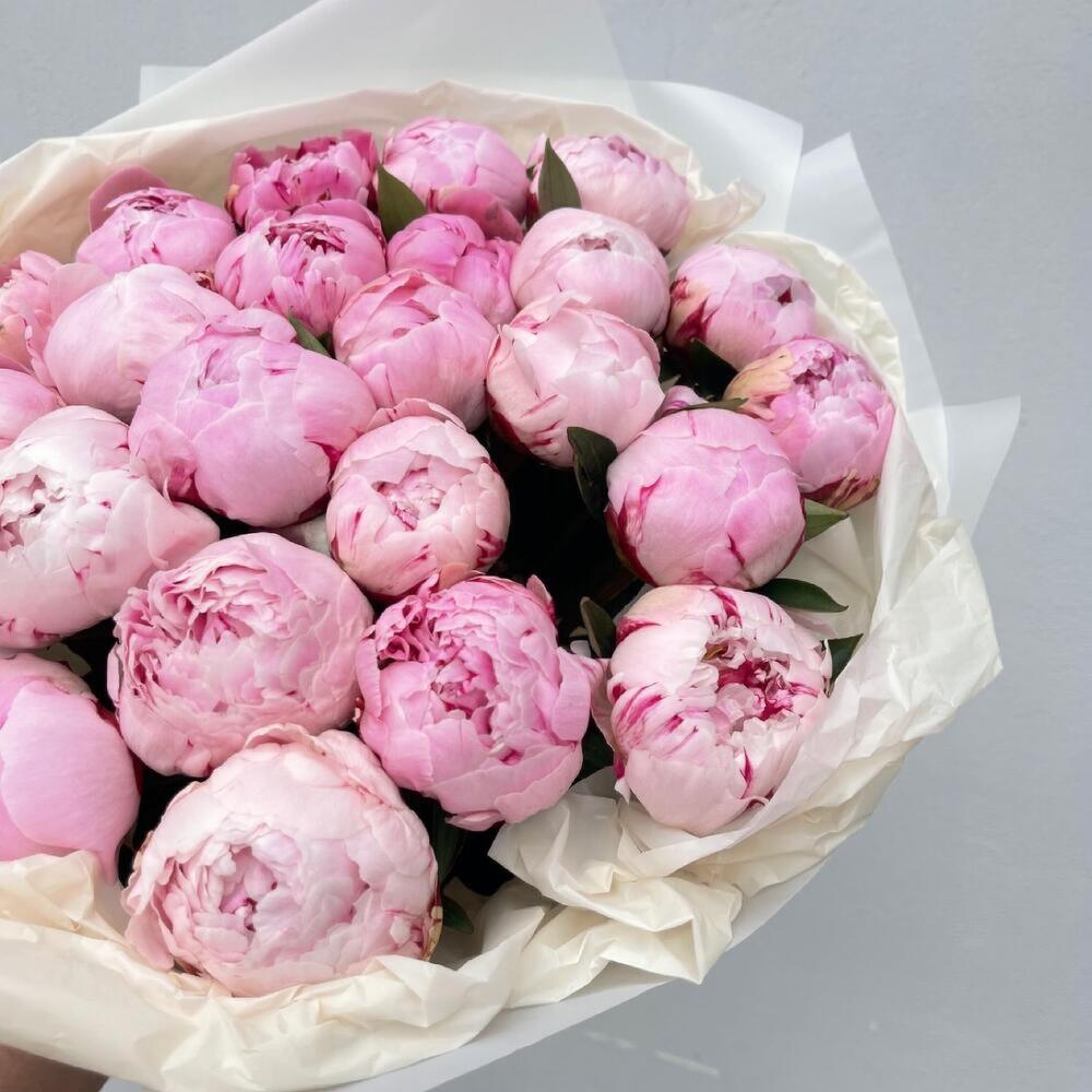 Пион розовый – 25 шт.Упаковка дизайнерская – 2 шт.Лента атласная – 2 шт.Открыточка с вашими пожеланиями – 1 шт.хорошее настроение – 100 шт.инструкция по уходу за цветами – 1 шт.коробка переноска – 1 шт.Кризал – 1 шт.