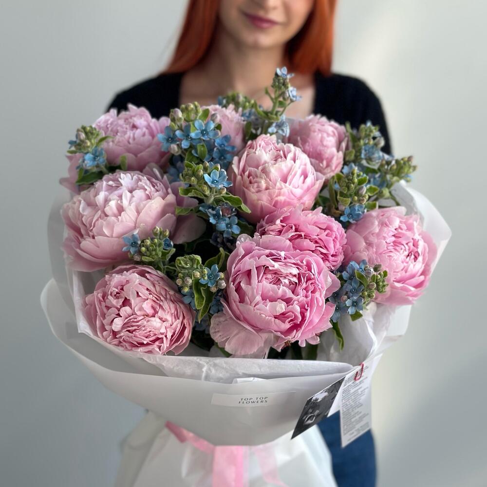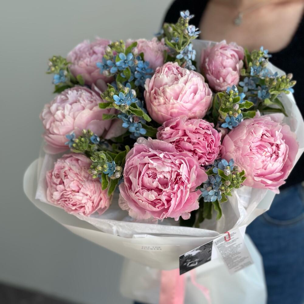 Букет пышных пионов с незабудками