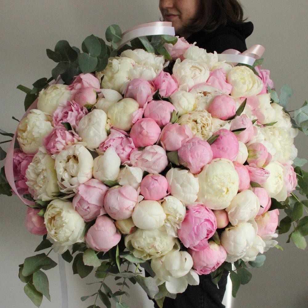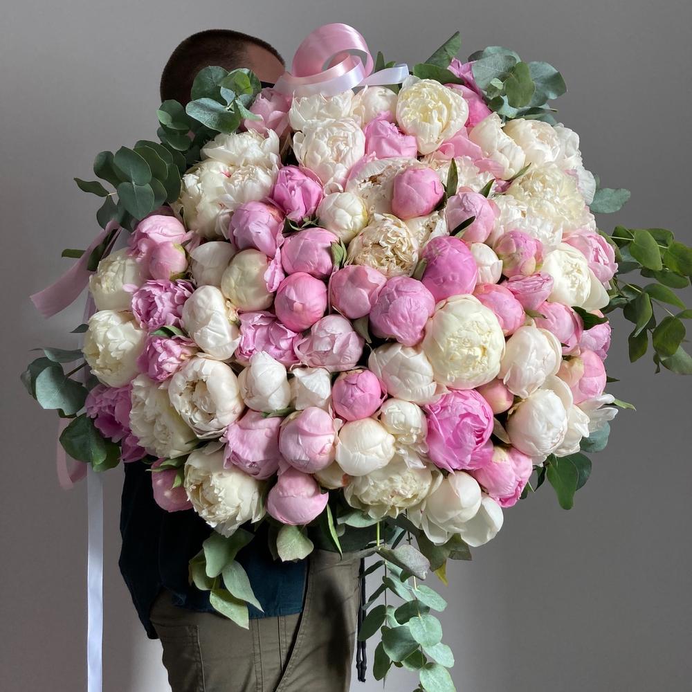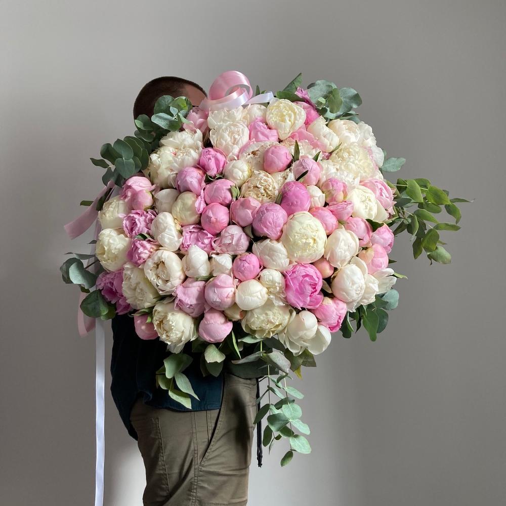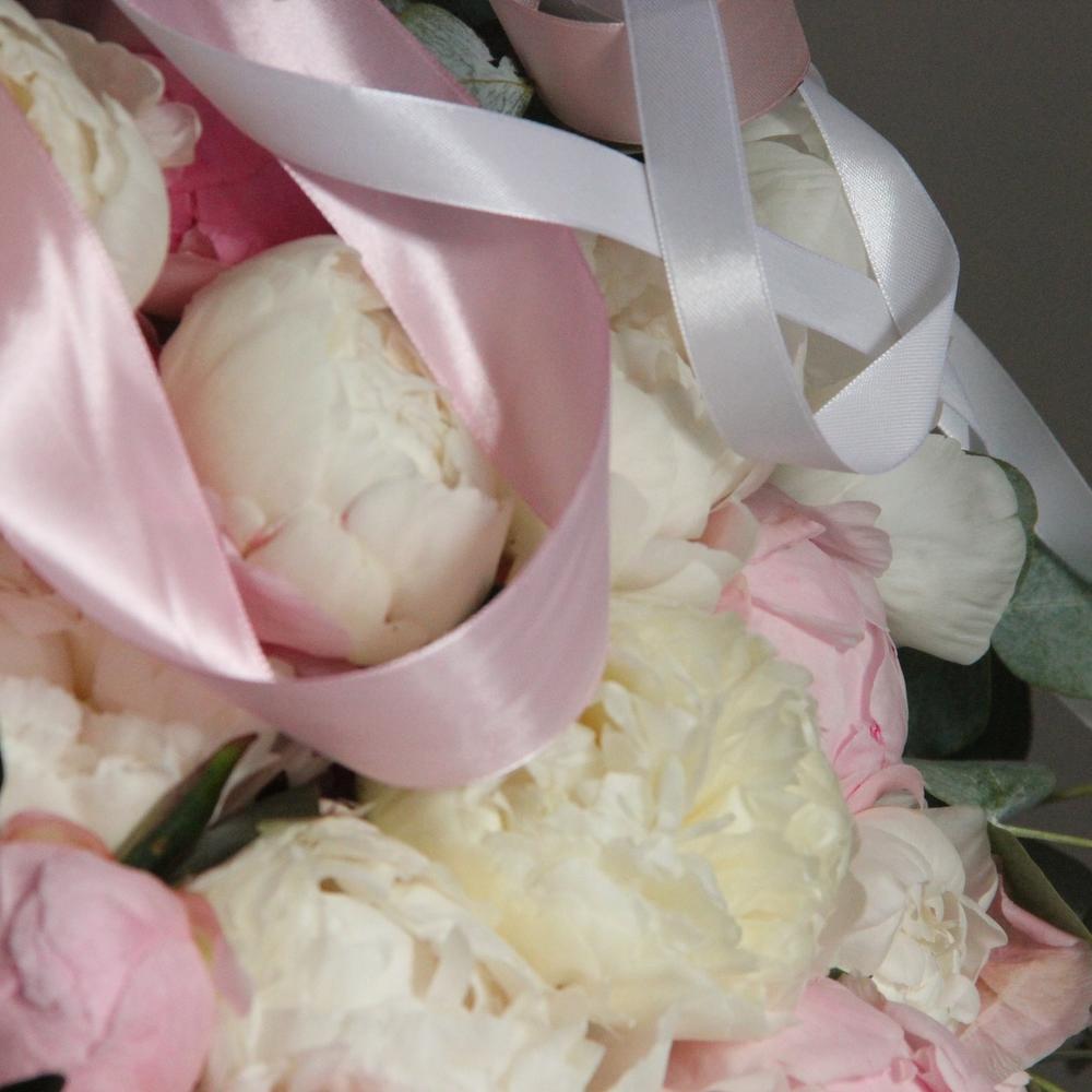 Эвкалипт – 15 шт.Лента атласная – 3 шт.пион франция – 75 шт.