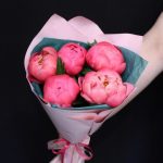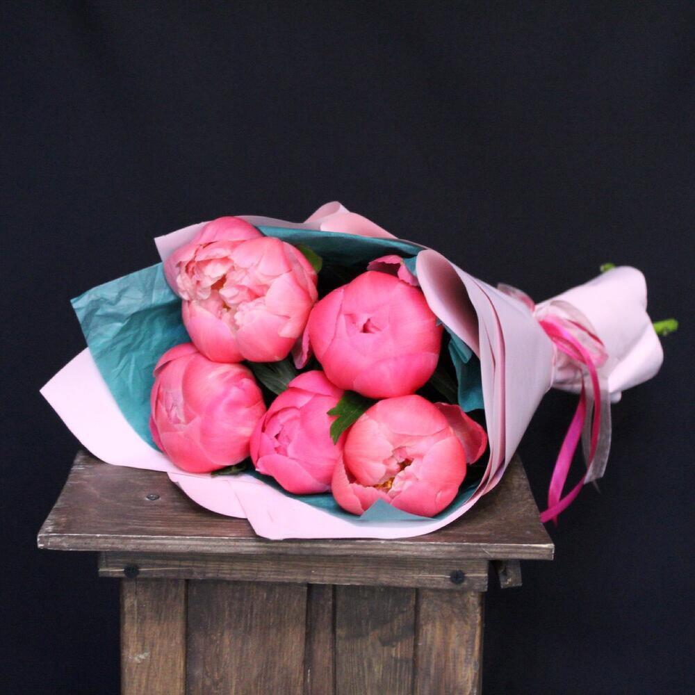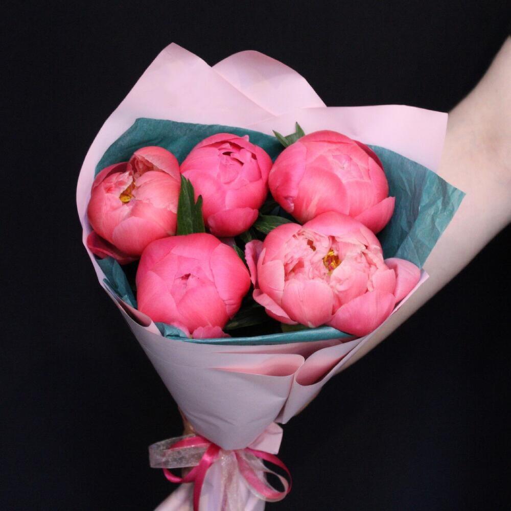 Лента атласная – 1 шт.Тишью – 2 шт.Пленка дизайнерская – 2 шт.пион coral charm – 5 шт.