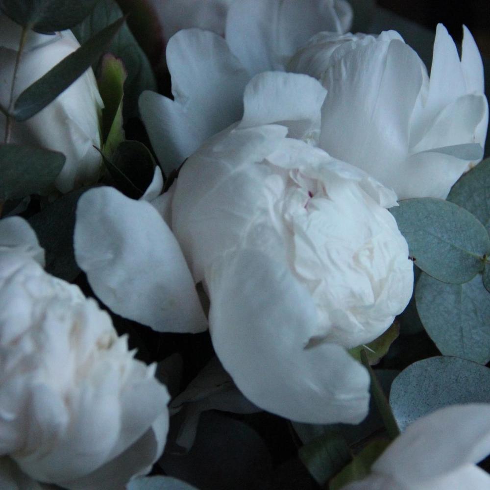 Моно букет из девяти белых пионов, с веточками эвкалипта, в лаконичной упаковке.Стильное цветочное решение для любого случая.
