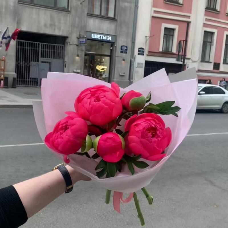 Лента – 2 шт.Пион – 5 шт.Упаковка дизайнерская – 2 шт.