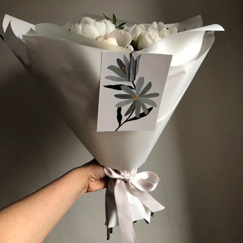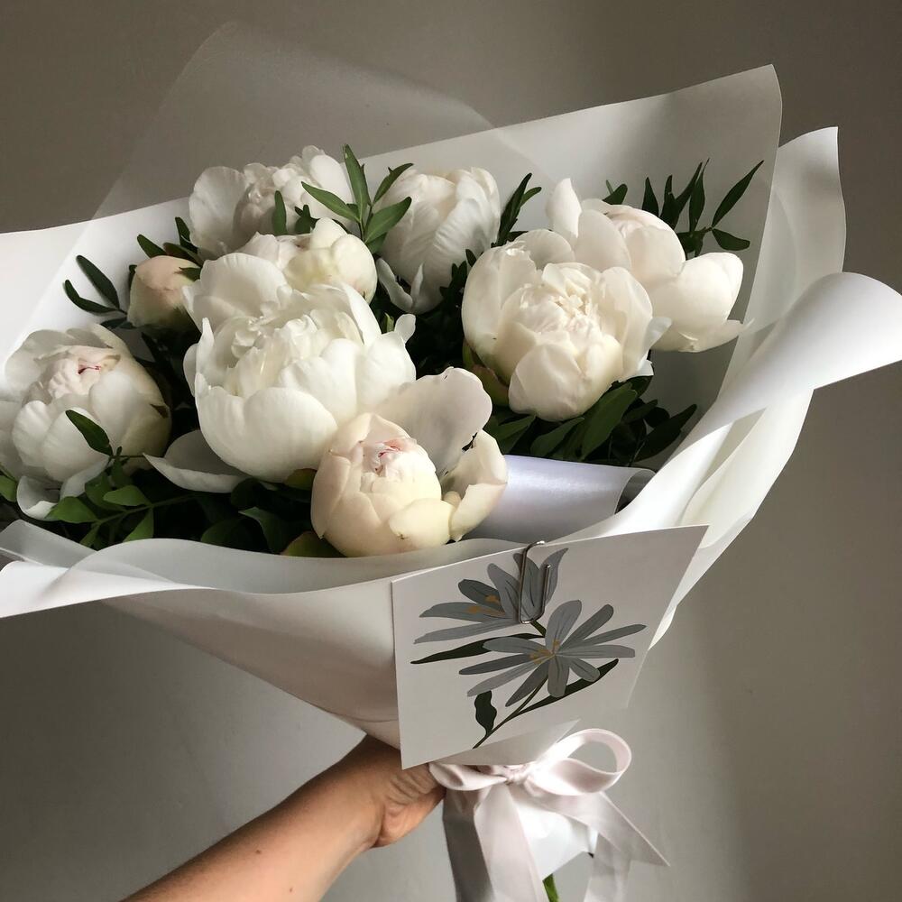 Лента – 2 шт.Зелень – 8 шт.Пион белый – 9 шт.Упаковка дизайнерская – 4 шт.