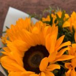 Букет из подсолнуха и роз с ромашками в дизайнерском оформлении