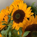 Букет из подсолнуха и роз с ромашками в дизайнерском оформлении