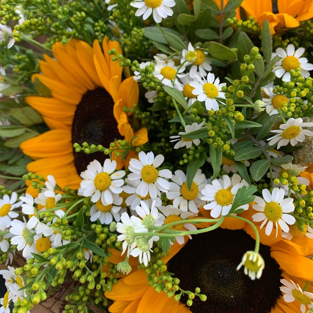 Подсолнух – 5 шт.Матрикария (Ромашка Камила) – 7 шт.Солидаго – 5 шт.триникум – 7 шт.Зелень – 3 шт.
