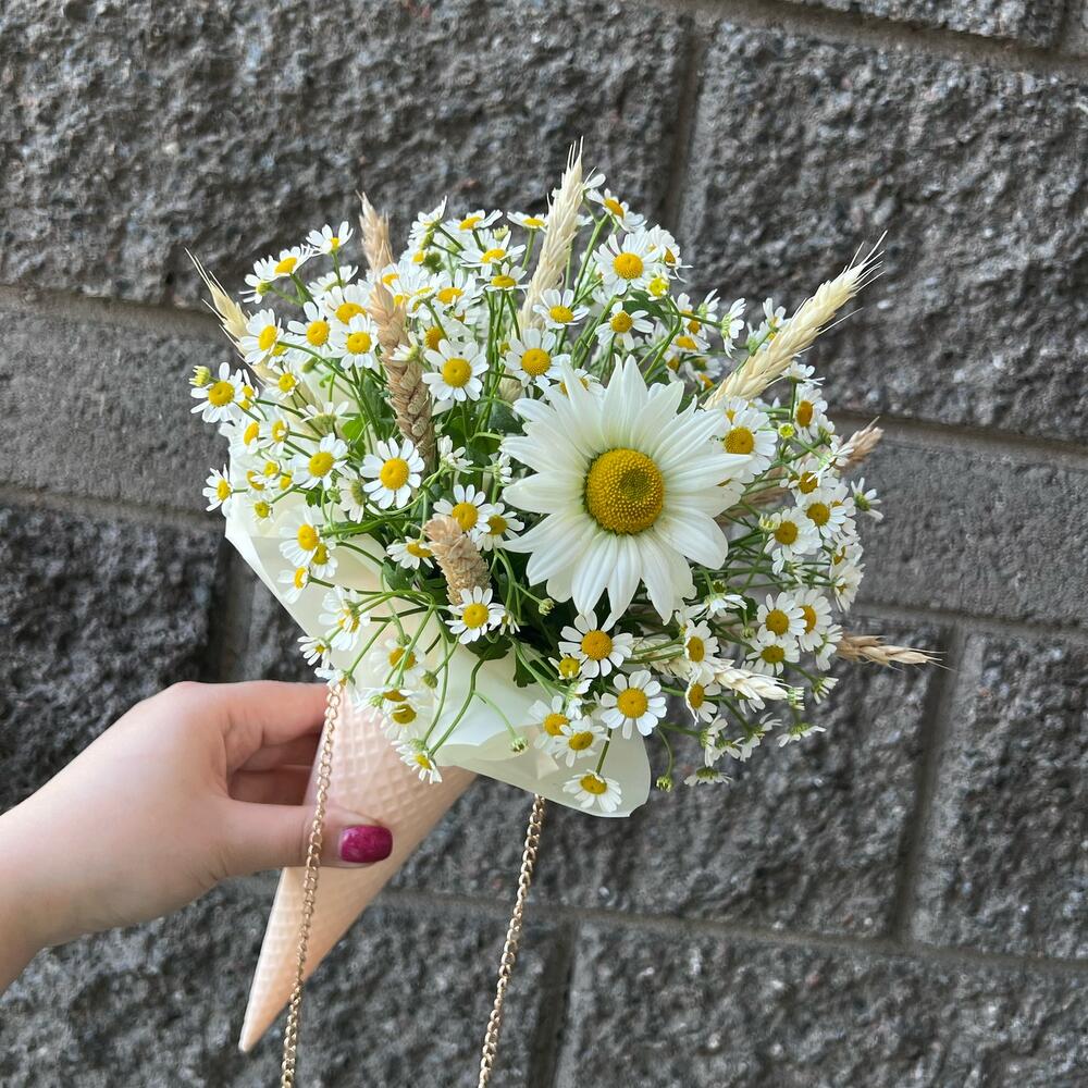 конус рожок – 1 шт.Калька упаковка – 1 шт.Оазис флористический – 1 шт.Ромашка кустовая – 4 шт.Ромашка одноголовая – 1 шт.Колосья – 10 шт.