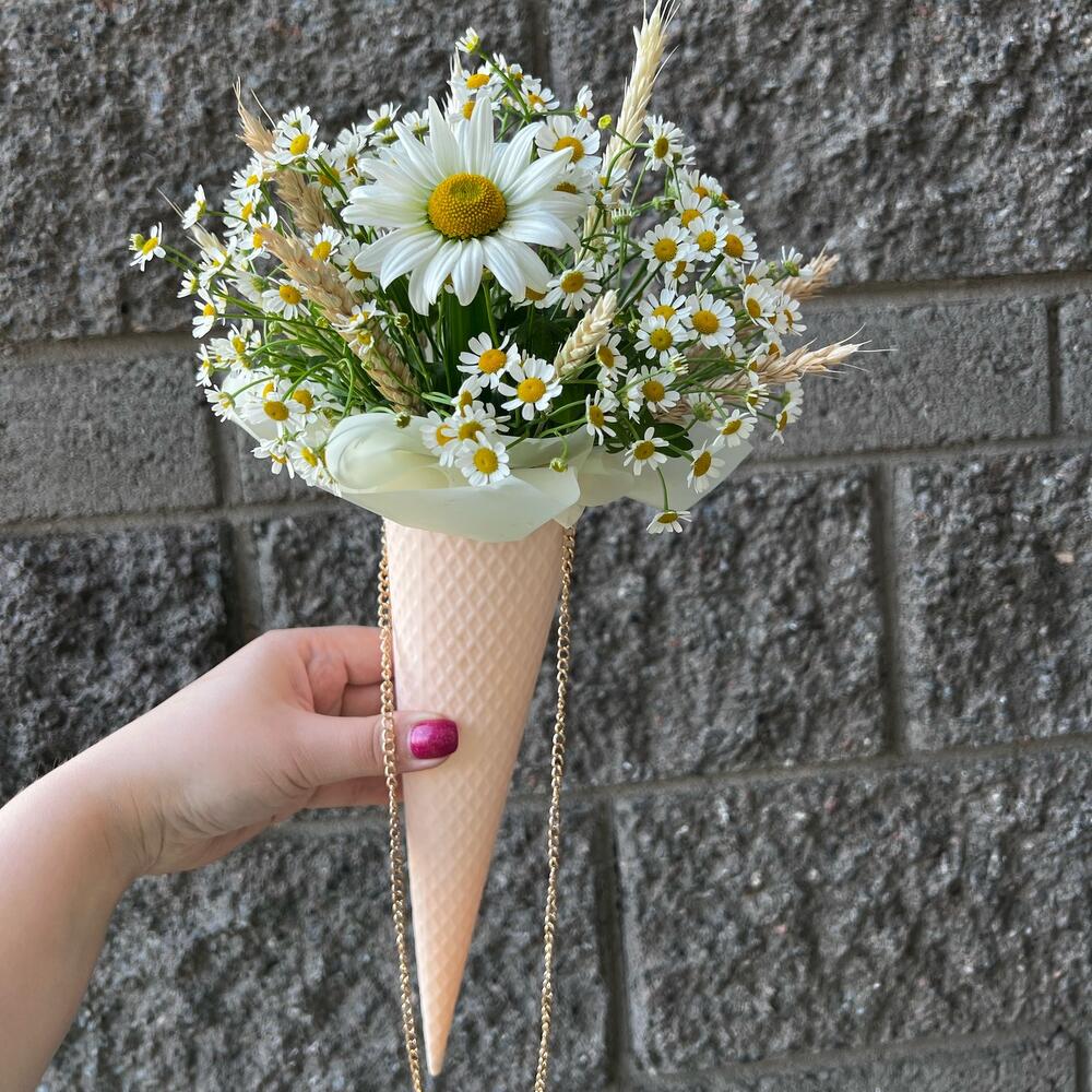 Цветы в рожке на цепочке с ромашками и колосьями пшеницы