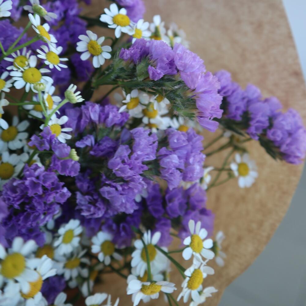 Статица – 2 шт.Матрикария (Ромашка Камила) – 4 шт.Крафт упаковка – 1 шт.бечевка натуральная – 1 шт.