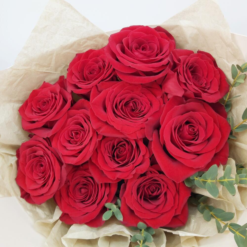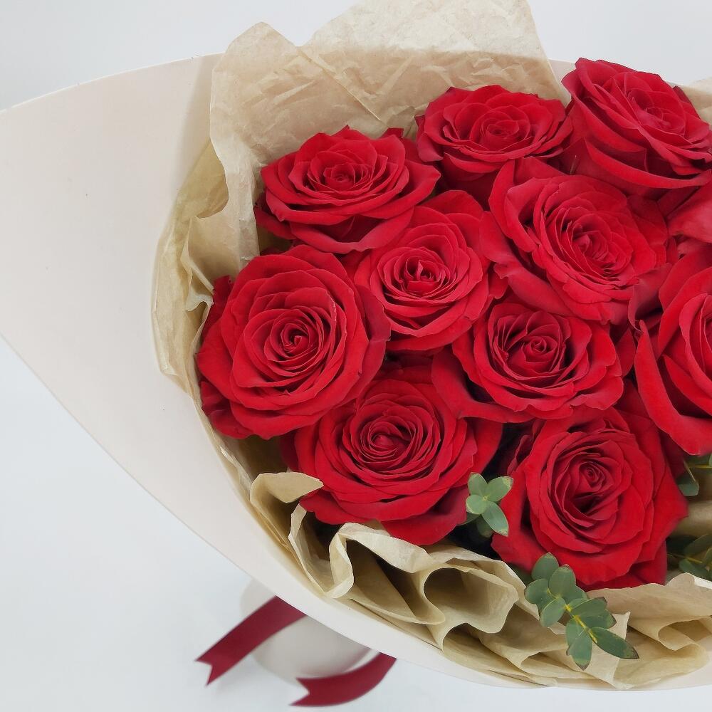 11 красных роз с эвкалиптом