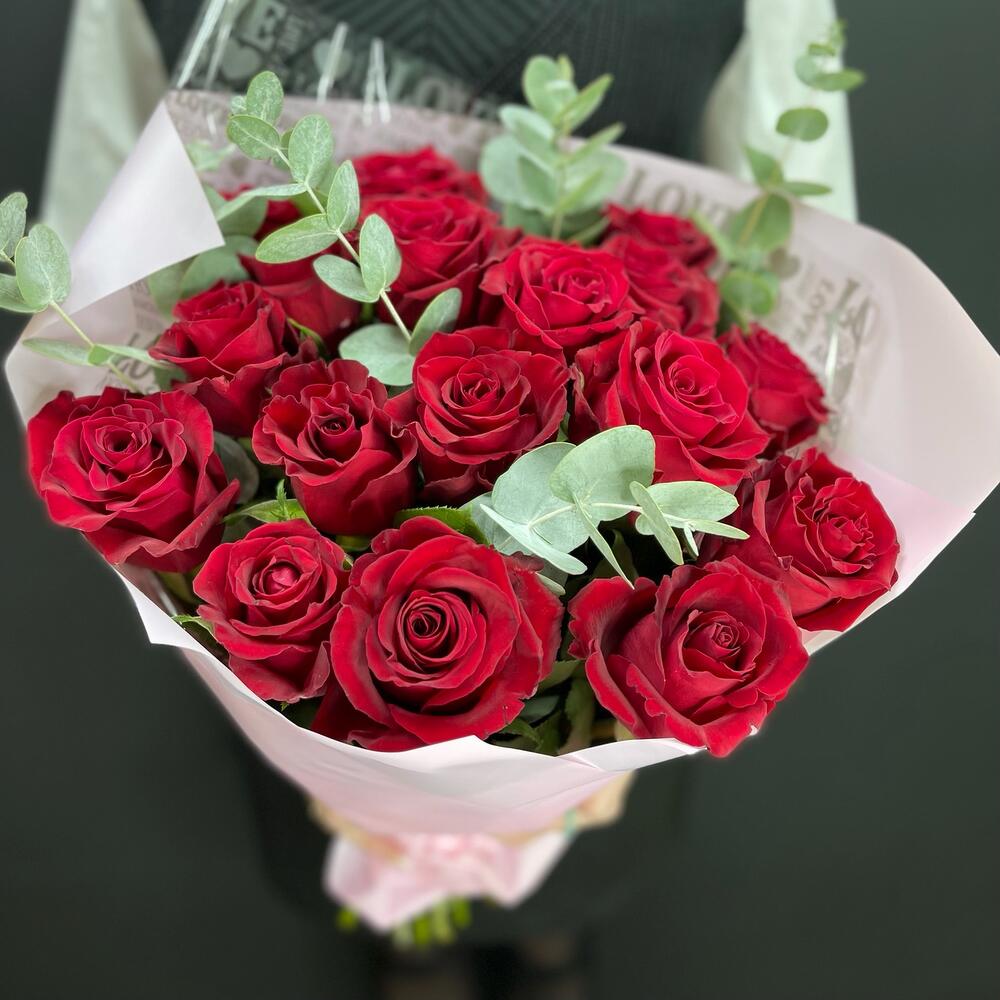 Роза – 17 шт.Эвкалипт – 5 шт.Упаковка дизайнерская – 5 шт.