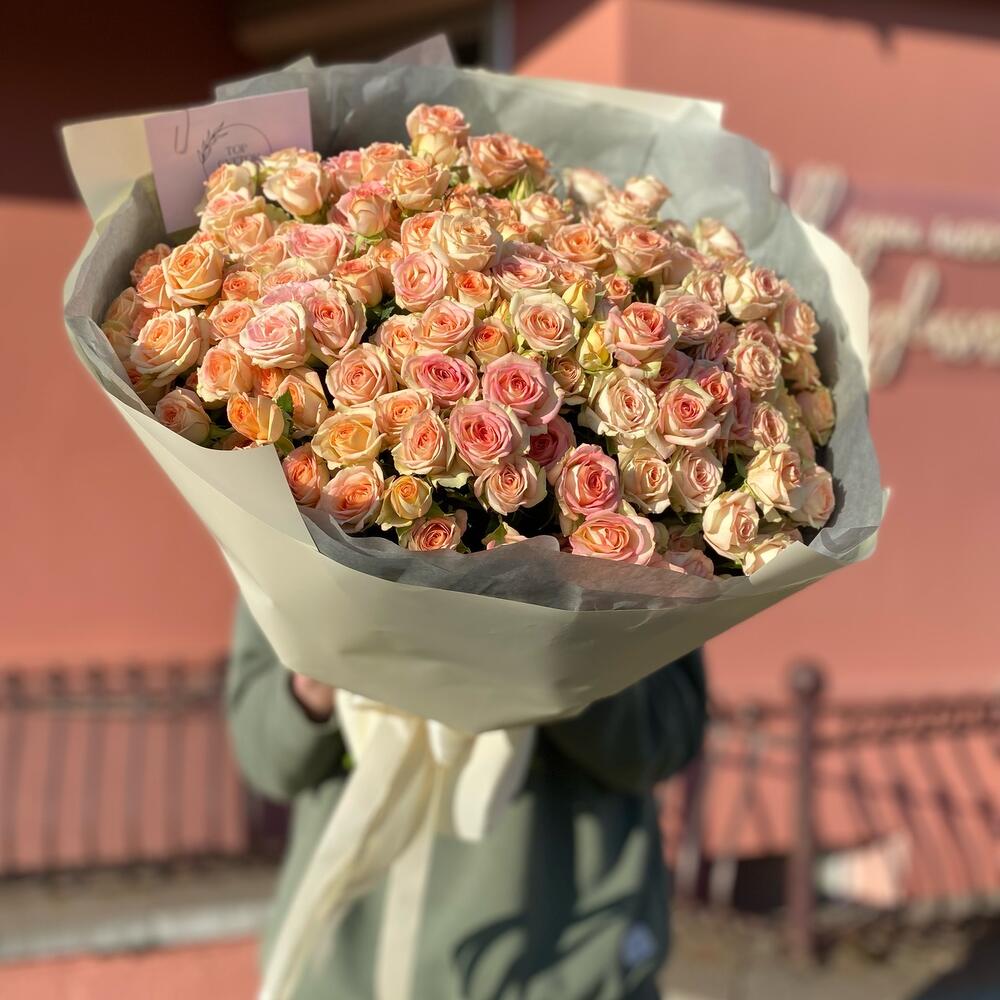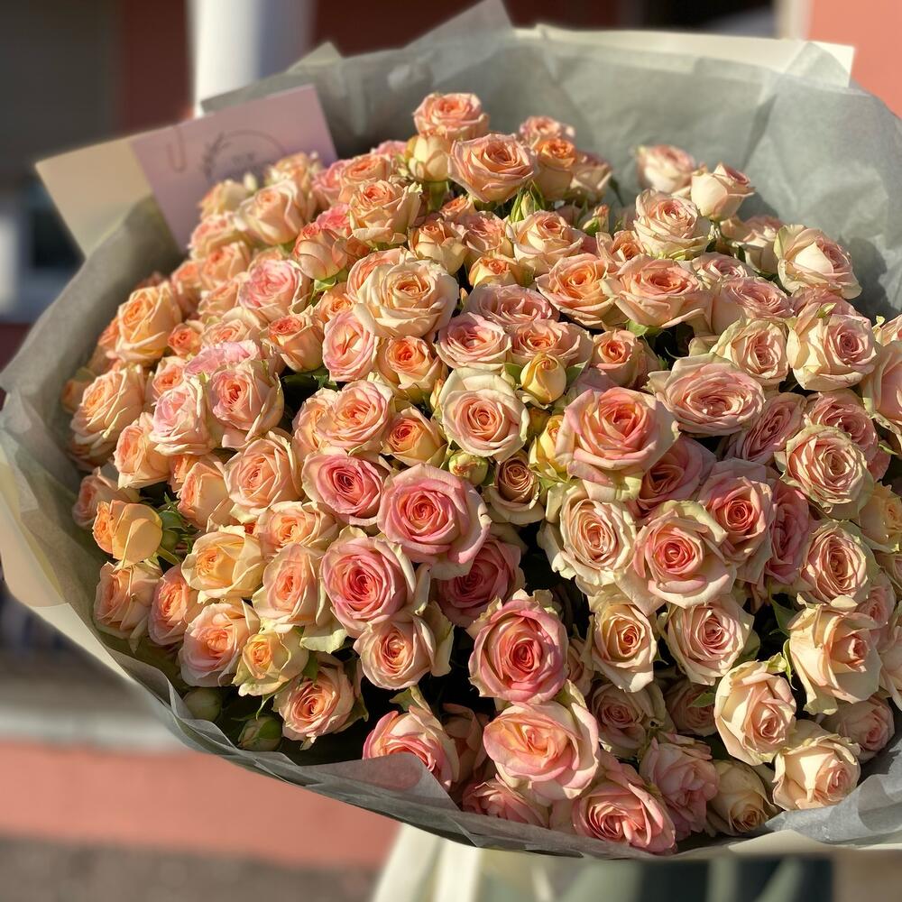 Букет из 25 кустовых веток сорта Azor с дизайнерским оформлением. Количество розочек (бутонов ) в букете может достигать 171 штуки