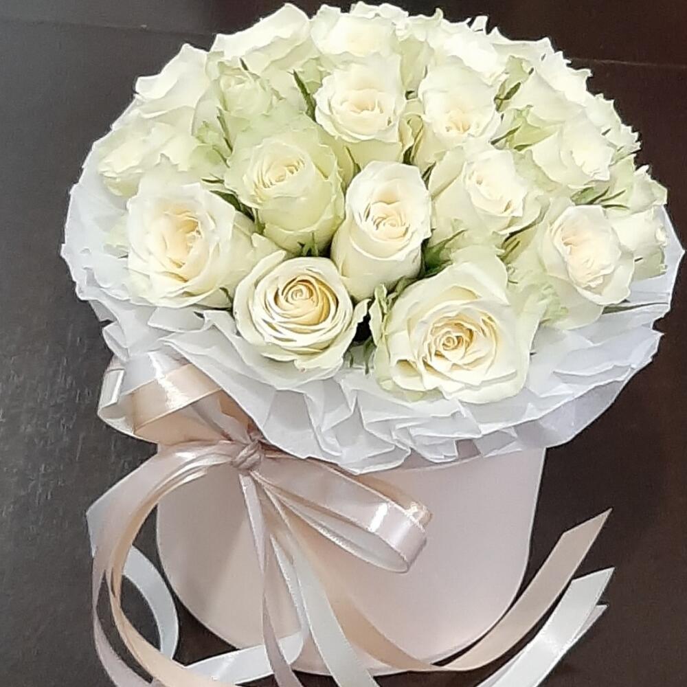25 белых роз в шляпной коробке