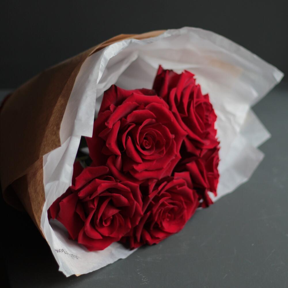 Упаковка дизайнерская – 2 шт.Лента атласная – 2 шт.роза красная эквадор 70 см – 5 шт.